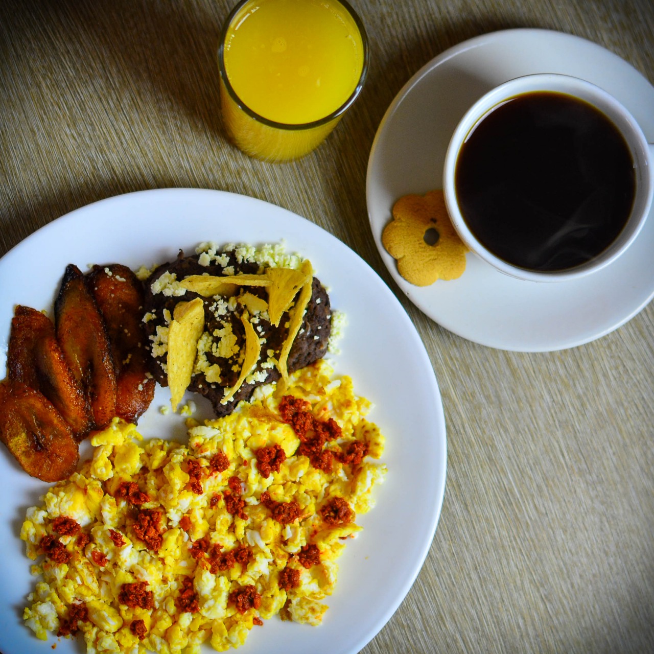 Acompañado de 2 tortillas fritas y 2 rebanadas de jamón de pavo. *Acompañados de frijoles refritos con queso, plátano frito y totopos.