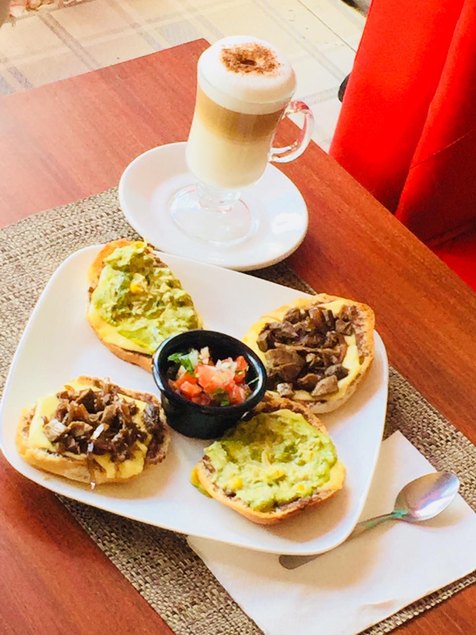 Con carne arrachera, queso manchego y cebollita preparada, acompañado de frijoles refritos y salsa de aguacate.