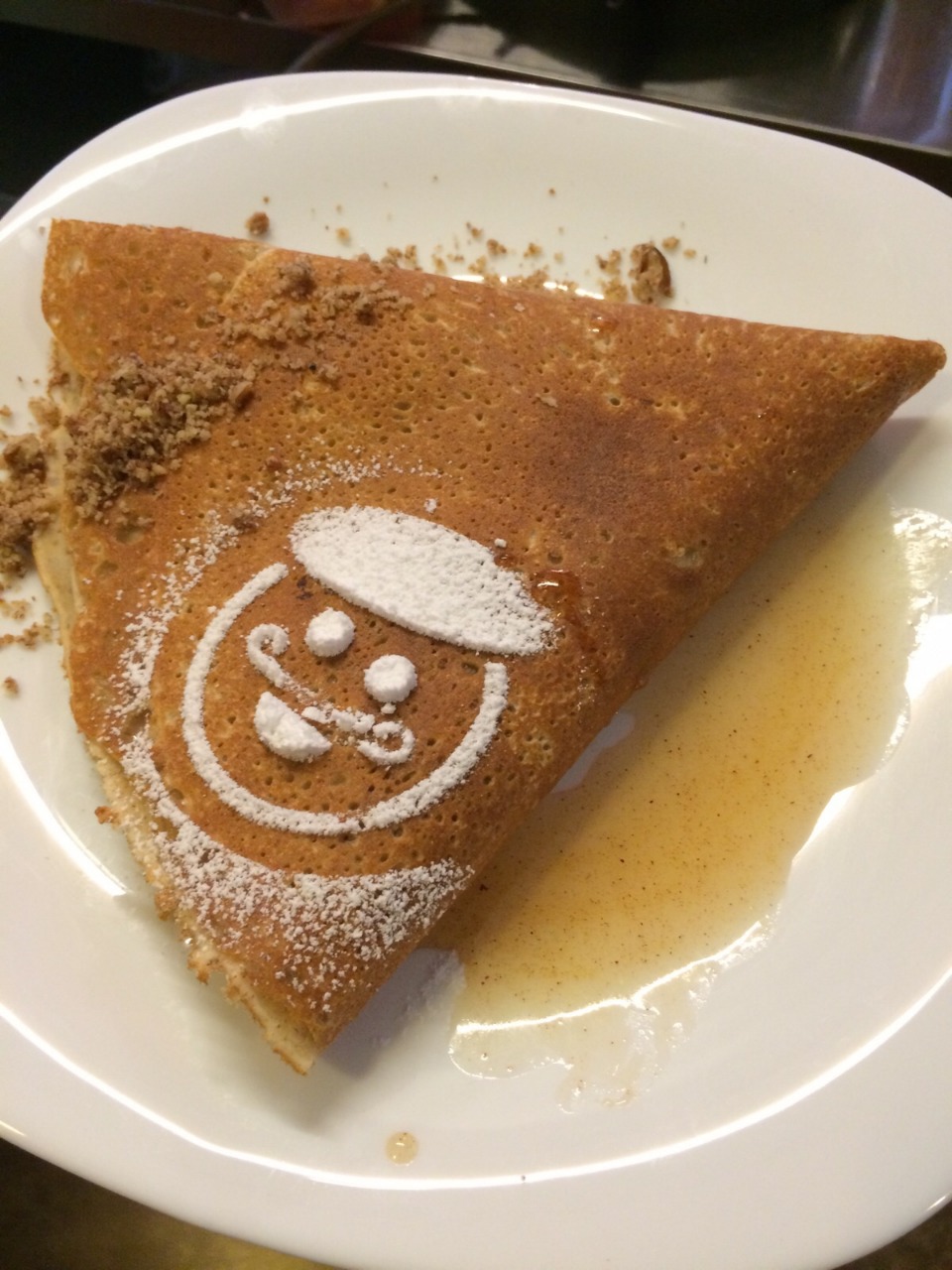 Nutella, plátano y fresa natural, decorada con cocoa y azúcar glass