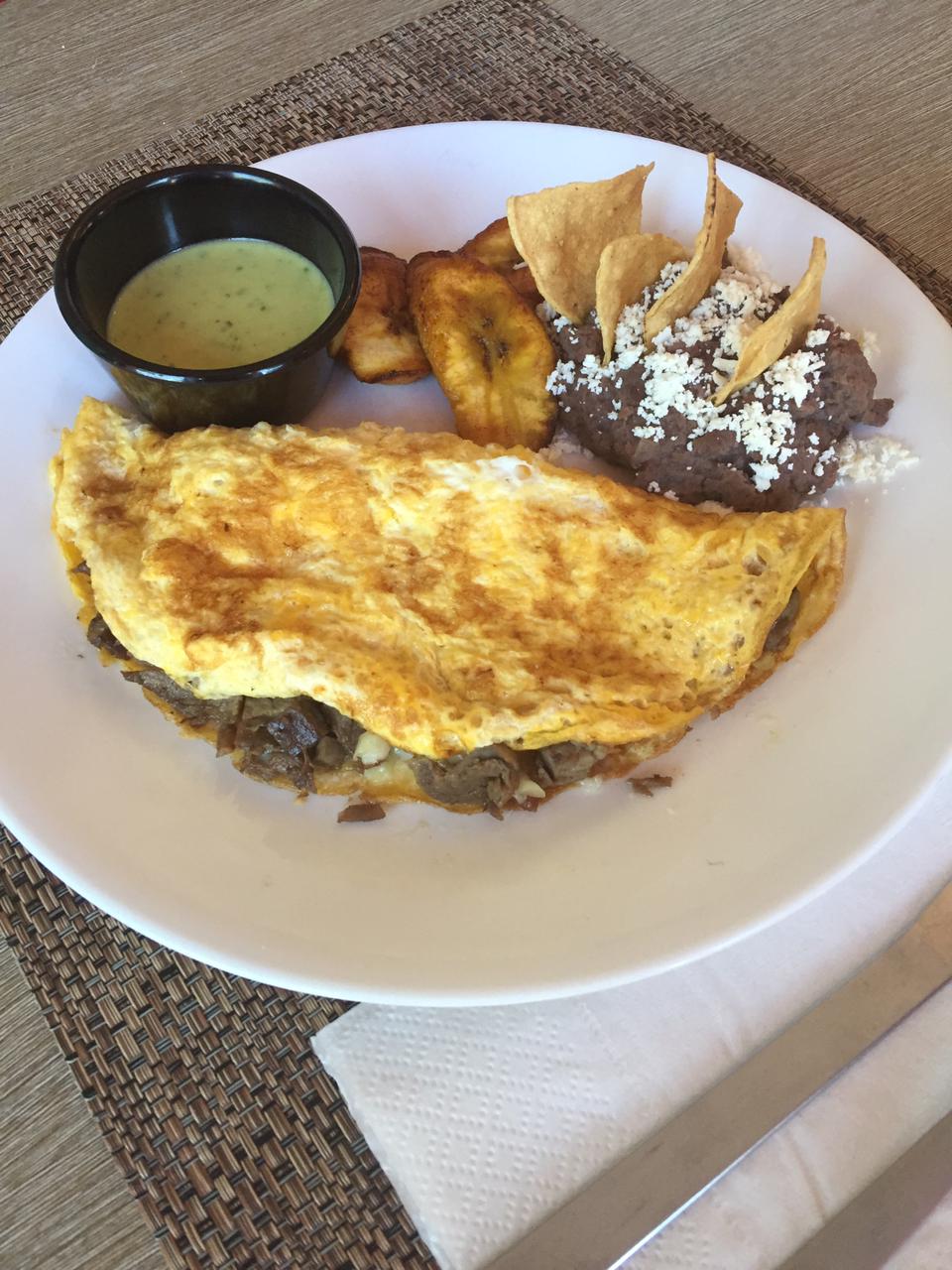 Con 2 ingredientes a escoger jamón de pavo, queso manchego, queso panela, espinacas o champiñones acompañados de frijoles refritos, plátanos refritos, salsa de tomate y totopos.