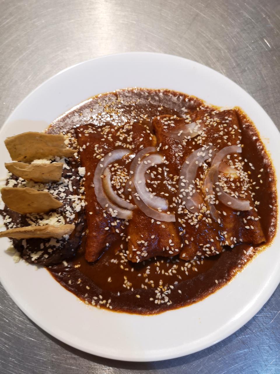 Orden de 4 tacos de pollo, con deliciosa Salsa de Mole, ajonjolí, rodajas de cebolla, queso fresco, acompañados con frijoles refritos y totopos.