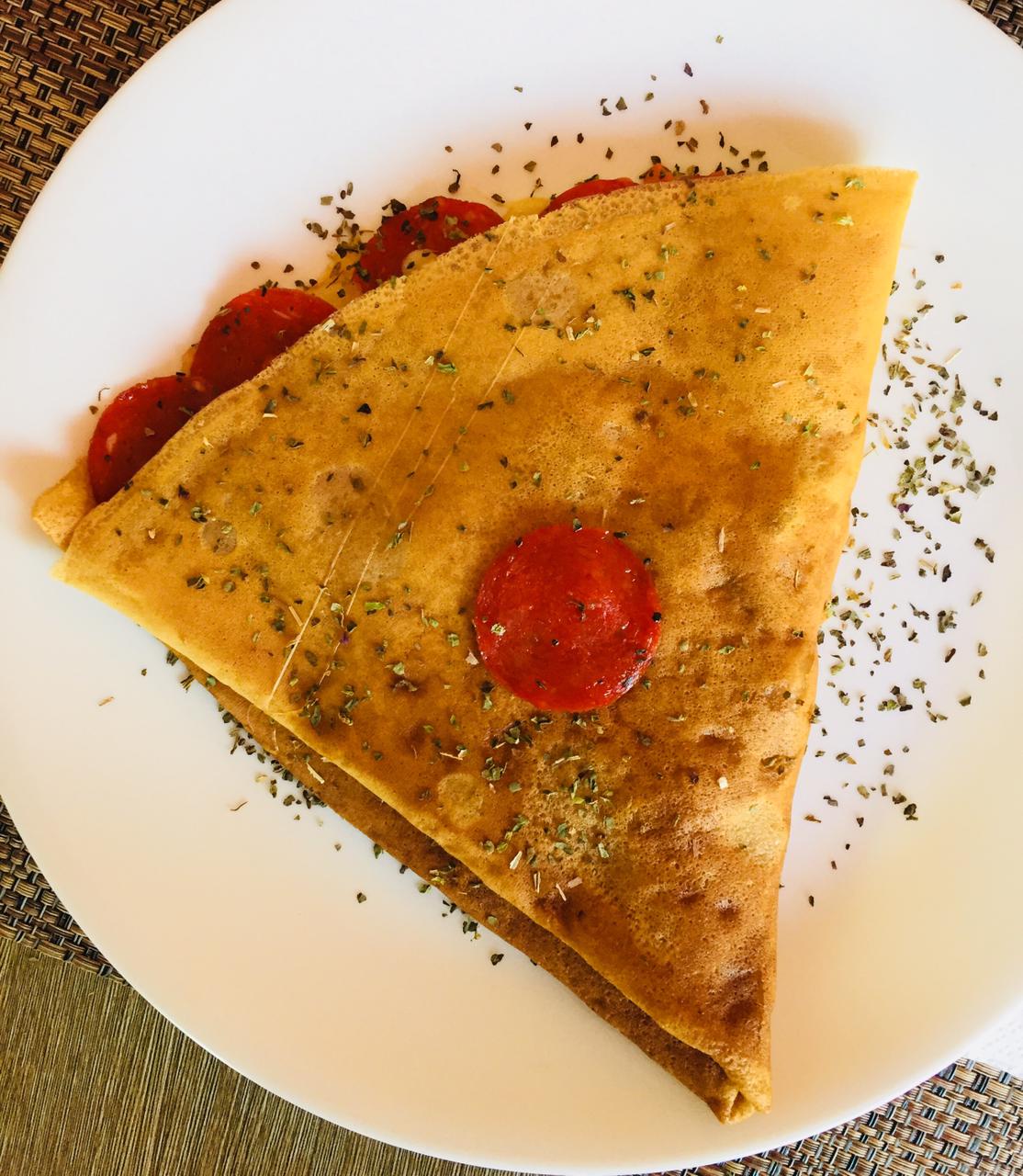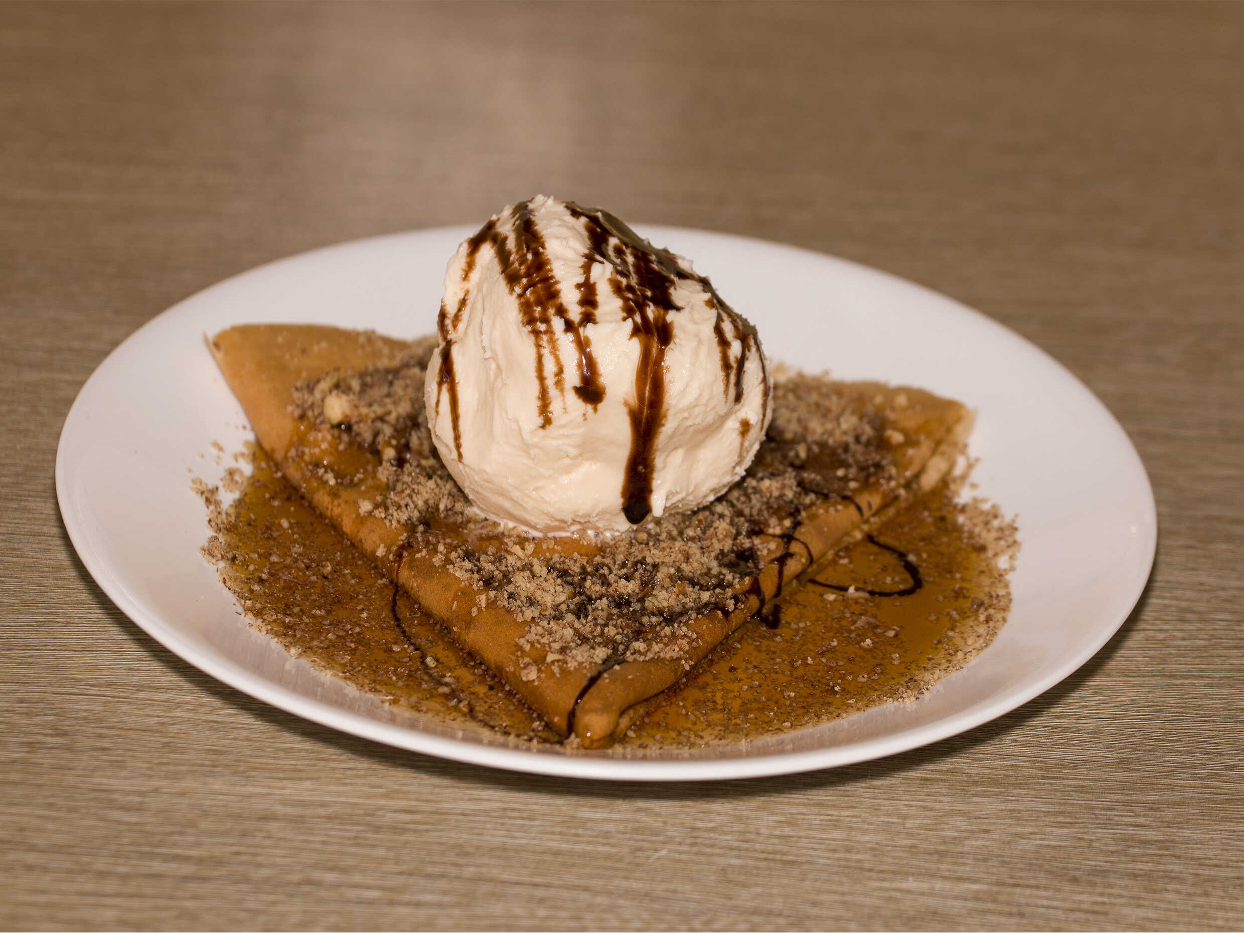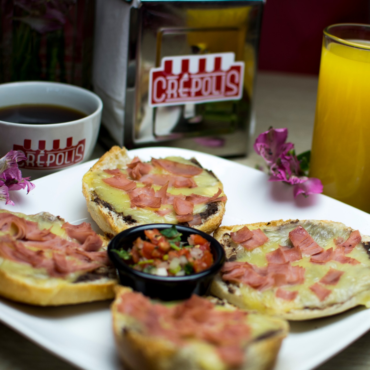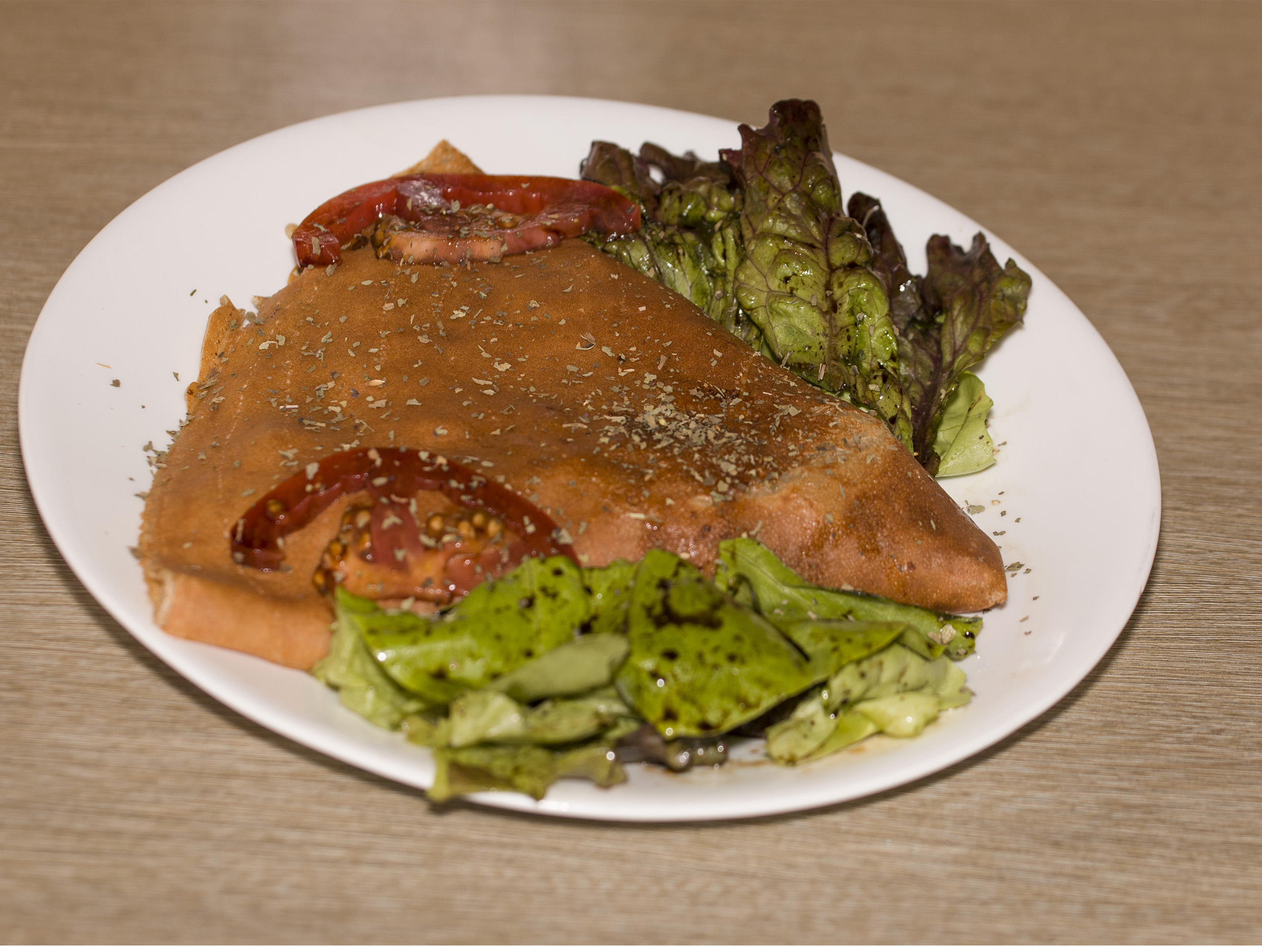 Crepa con omelette de jamón y queso, acompañada de aderezo de chipotle y hierbas finas.