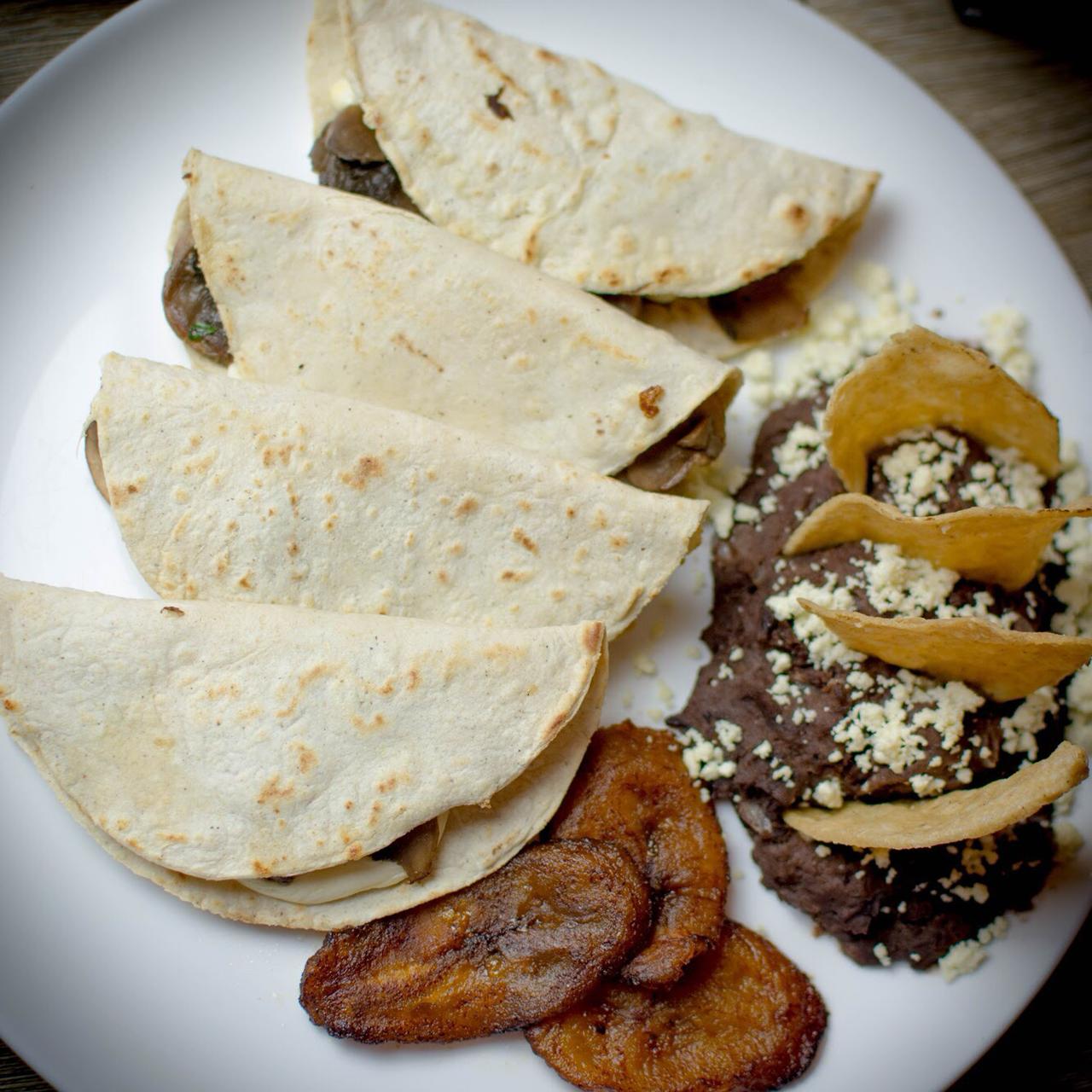 Orden servida con 4 quesadillas de queso panela o de hebra con tortilla de maiz acompañadas de frijoles y plátano frito.