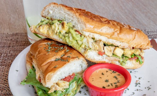 Exquisito pan de baguette, pechuga de pollo, queso manchego, tomate , lechuga , aguacate, mayonesa y mostaza.