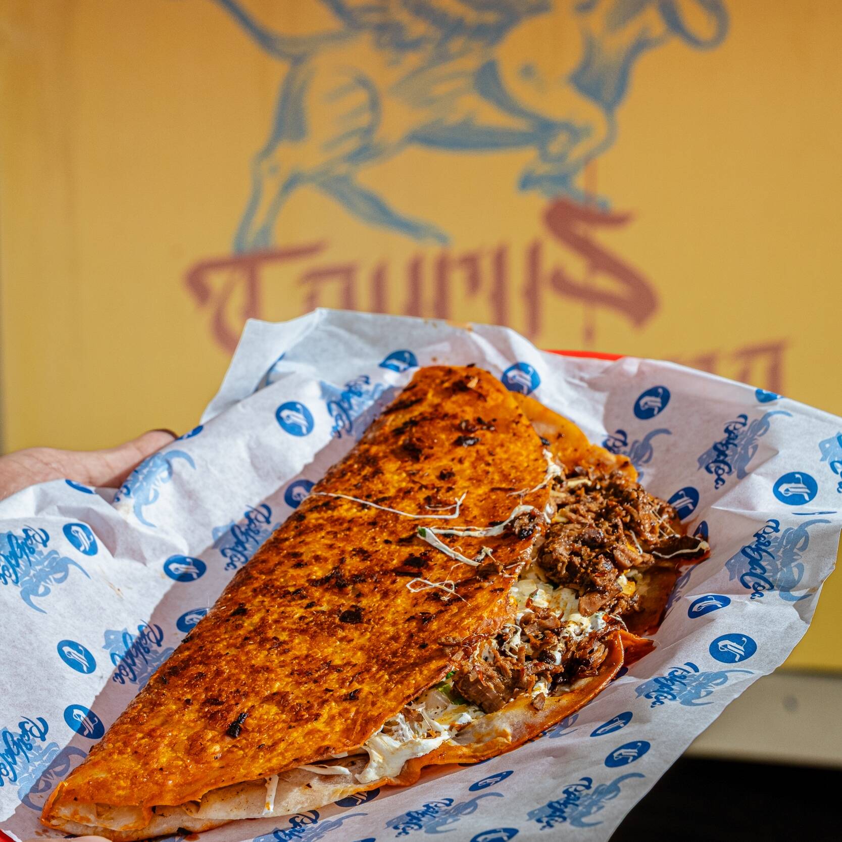 Tortilla de harina de 30 centímetros pintada con sabor, birria de res, queso ranchero derretido, mix de cebolla-cilantro. Consomé de cortesía. ¡La estrella de la casa!