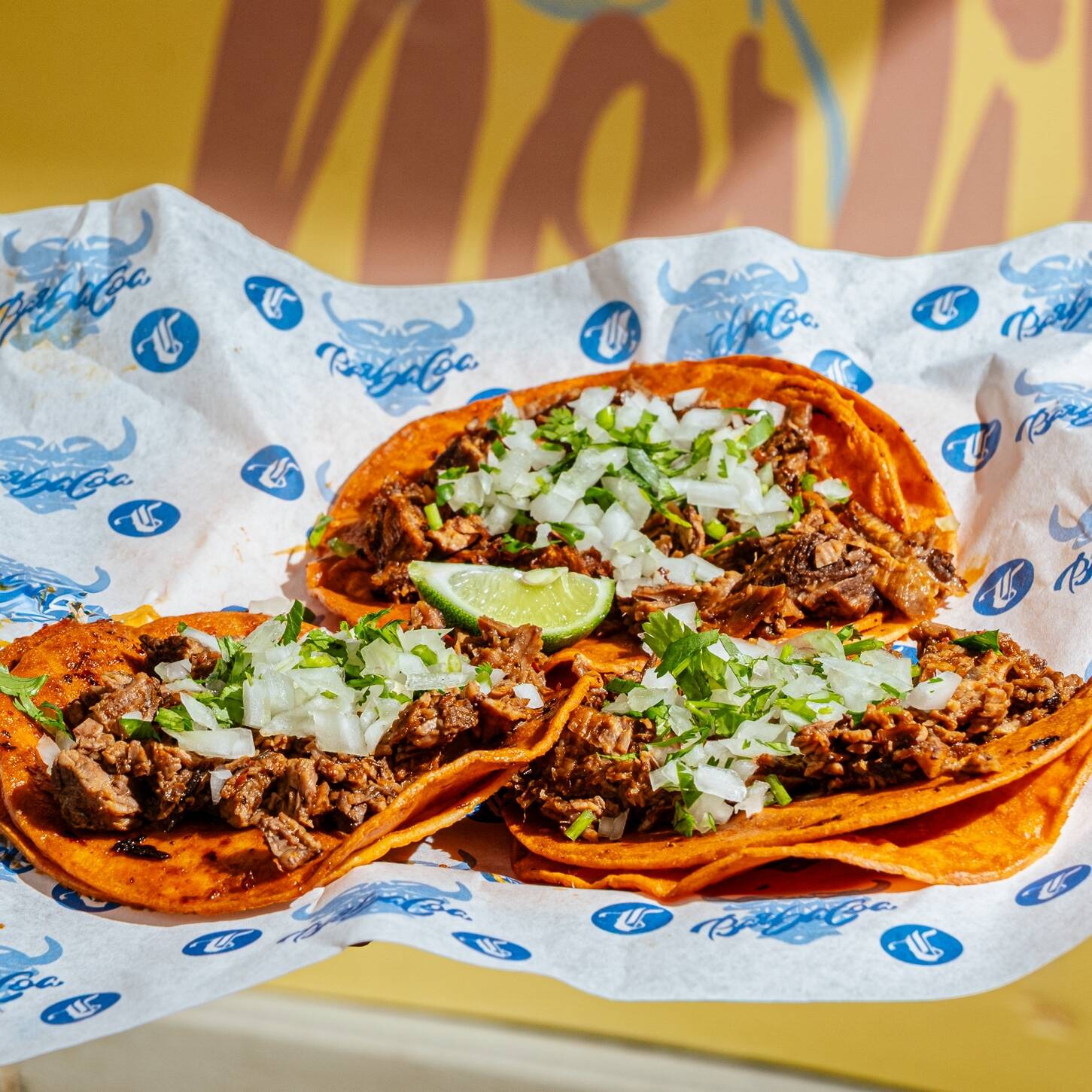 Taco de maíz con copia pintado con sabor, birria de res y mix de cebolla-cilantro. Consomé de cortesía. ¡Pídelo de pilón!