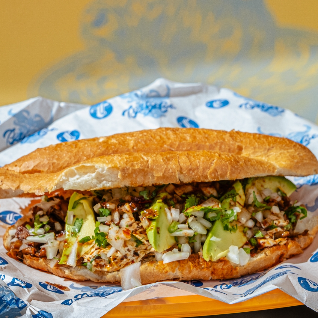 Torta de pan telera con mayonesa untada, birria de res, queso ranchero derretido y aguacate. Consomé de cortesía. ¡Sumérgela en consomé!