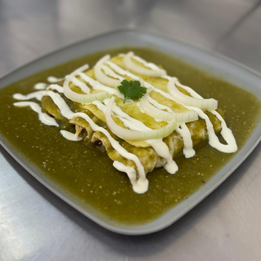 4 Enchiladas Suizas, Preparadas con Pollo, Salsa Verde, Queso Gouda Gratinado, Cebolla, Crema y Cilantro.