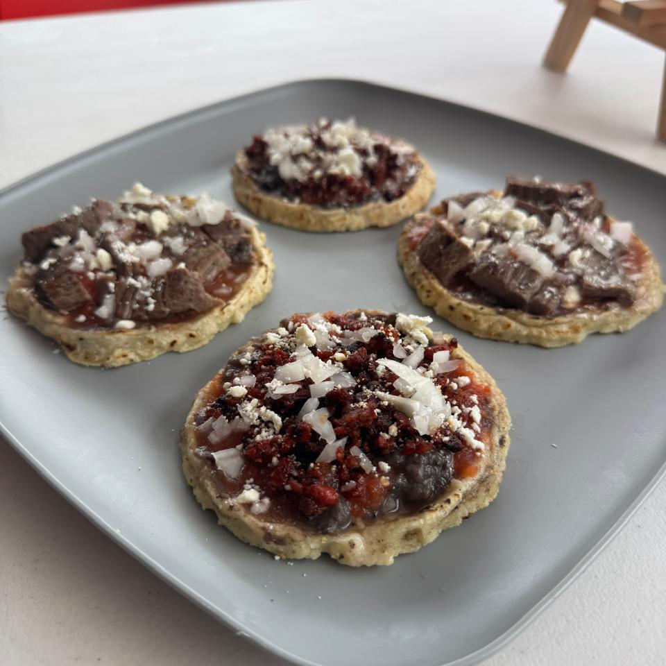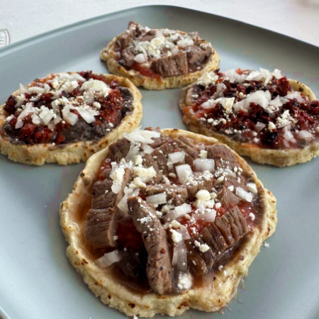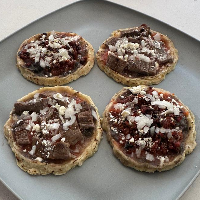 4 Sopes Preparados con Frijol, Salsa de Tomate, Cebolla, Queso Sopero y Cecina de Res.