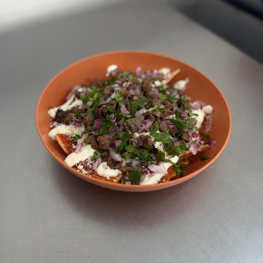 Chilaquiles bañados en salsa roja con queso desboronado, crema, cecina de res, cebolla morada y cilantro.