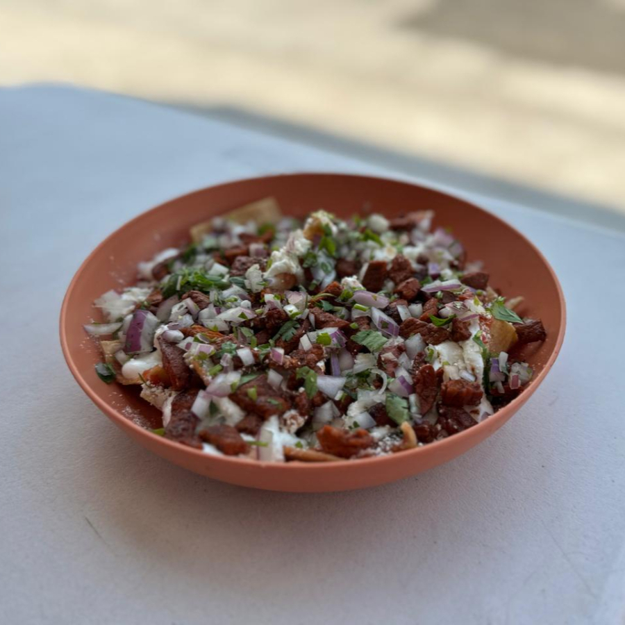 Chilaquiles bañados en salsa roja con queso desboronado, crema, carne al pastor, cebolla morada y cilantro.