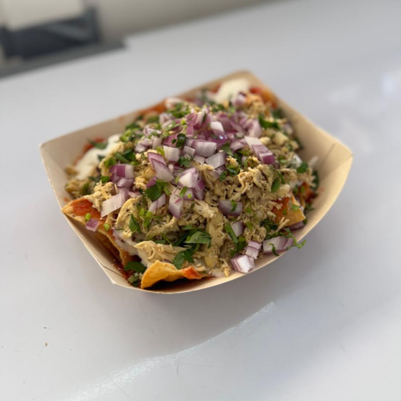 Chilaquiles bañados en salsa roja con queso desboronado, crema, pollo, cebolla morada y cilantro.