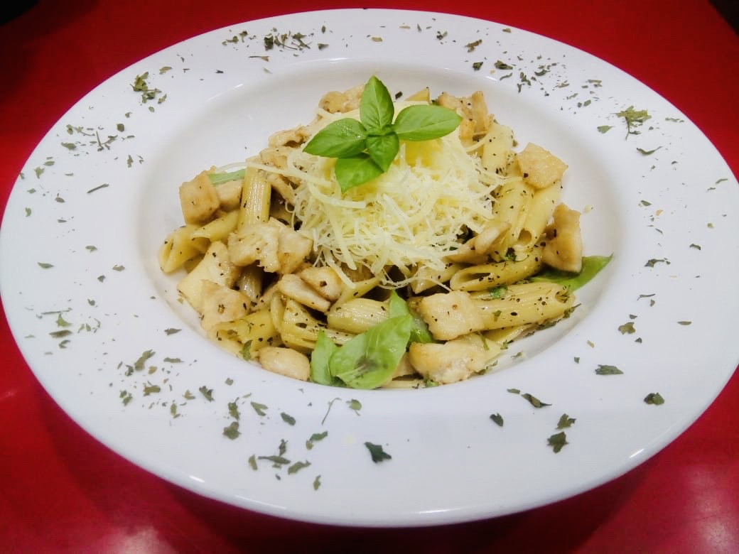 Deliciosa pasta preparada con vino blanco, especies italianas jitomates cherry y albahaca fresca con pechuga de pollo