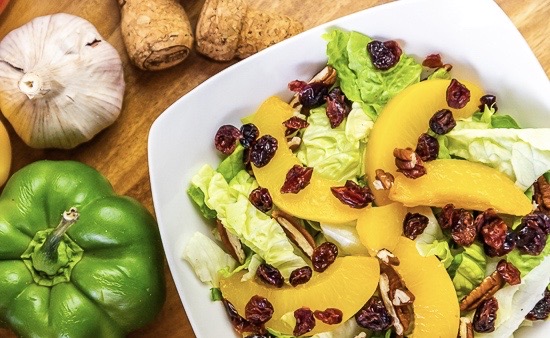 Agridulce elaborada con lechuga romana, albahaca, duraznos o piña en almibar, arandanos deshidratados, nueces y aderezo de mostaza y miel