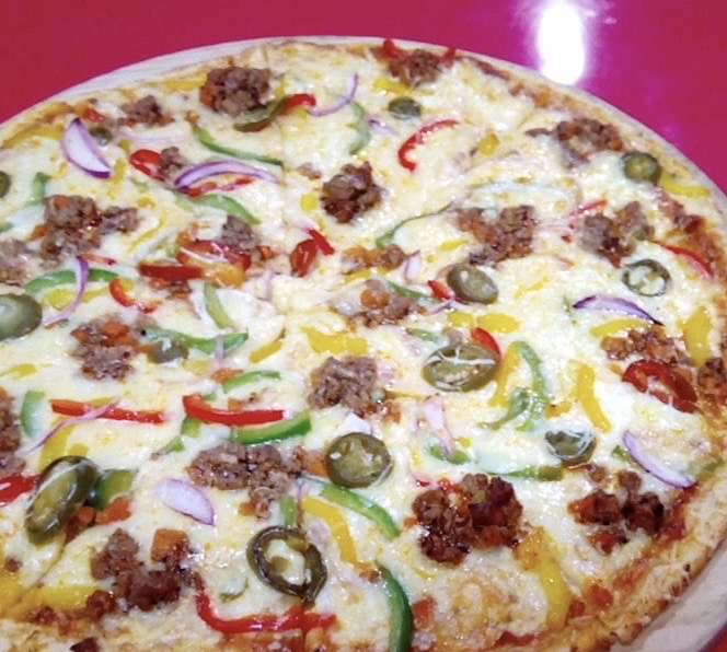 Deliciosa masa artesanal delgada, crujiente con nuestra salsa pomodoro, mezcla de quesos, carne bolognesa, cebolla pimientos y chiles jalapenos