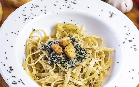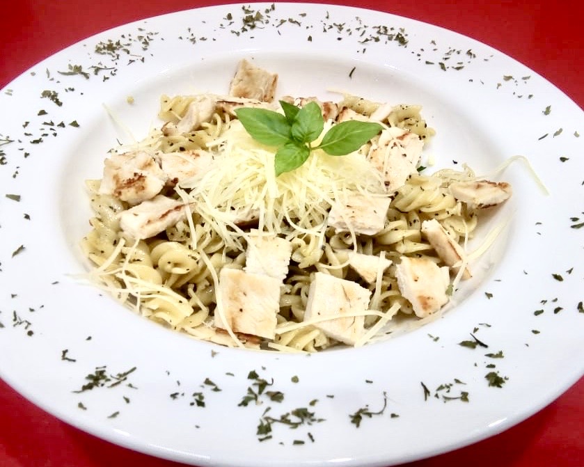 250 GRS DE PASTA A ELEGIR ACOMPAÑADA DE NUESTRA SALSA PESTO HECHA CON ALBHACA ORGANICA Y NUECES, SERVIDA CON QUESO PARMESANO Y PAN DE AJO