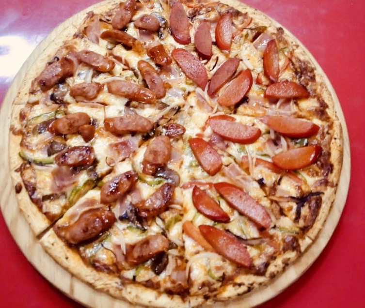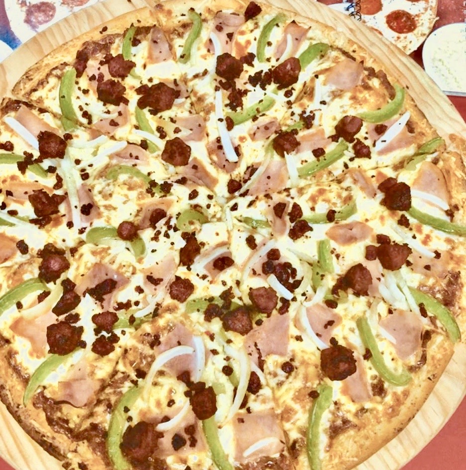 Deliciosa masa artesanal delgada, crujiente con nuestra salsa pomodoro, mezcla de quesos, salchicha alemana, jamon horneado, cebolla y pimientos