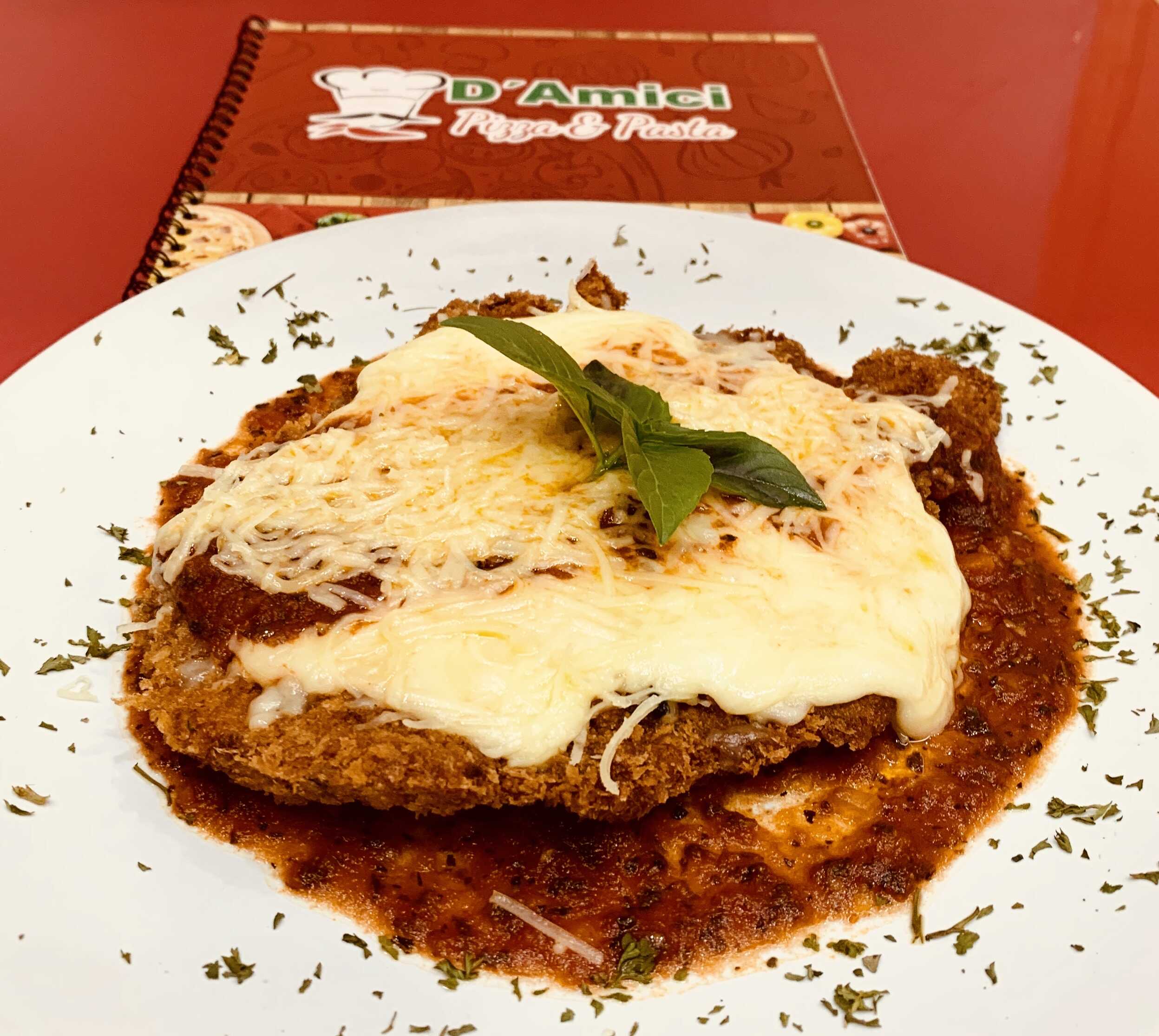 Exquisita pechuga de pollo empanizado con queso parmesano, servido en una cama de salsa pomodoro y cubierta de nuestra mezcla de quesos