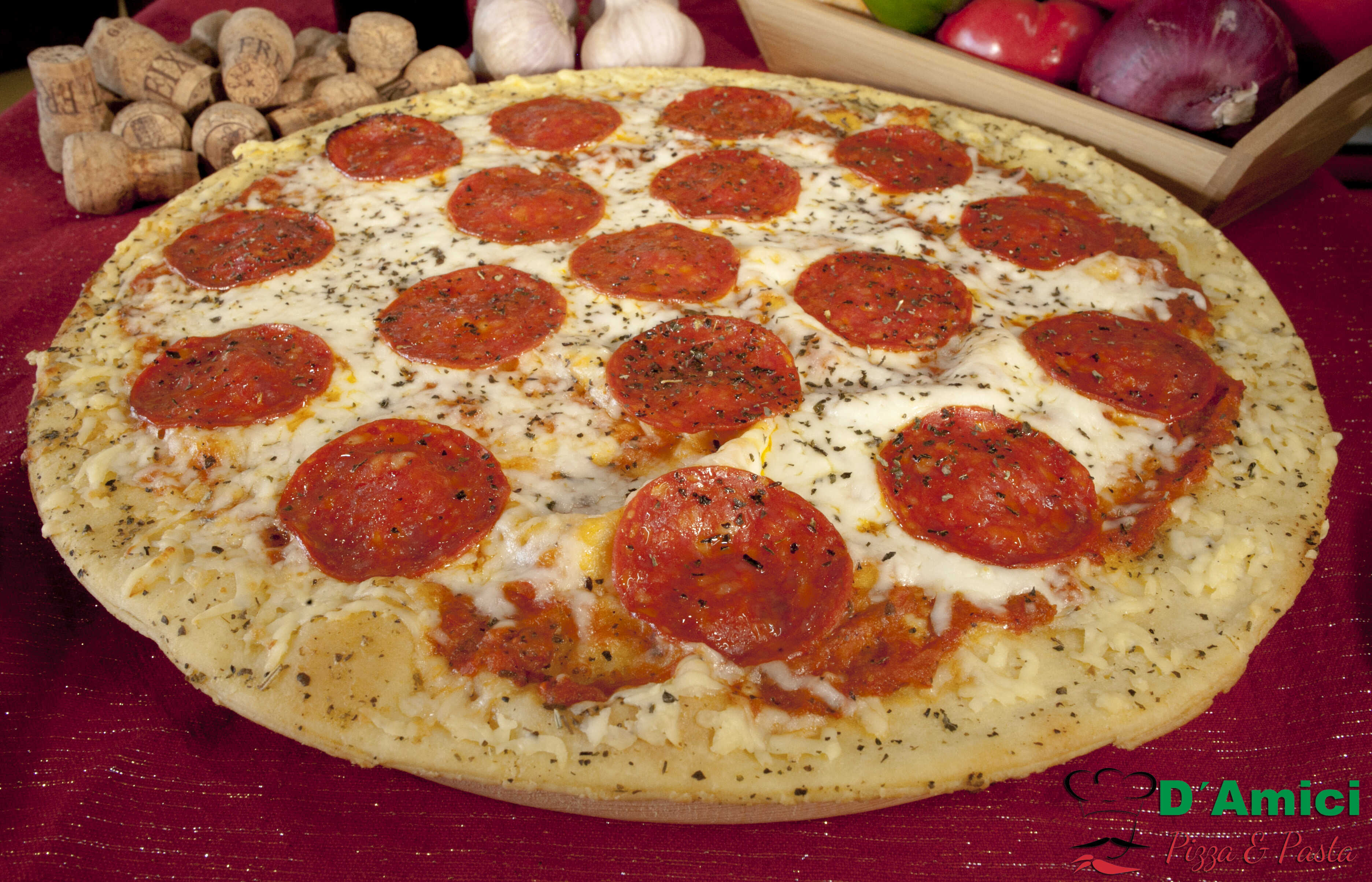 Deliciosa masa artesanal delgada, crujiente con nuestra salsa pomodoro, mezcla de quesos y pepperoni