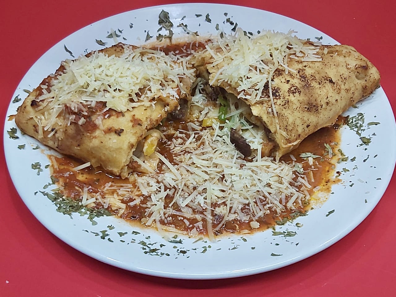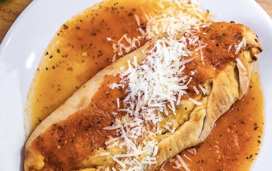 Exquisito calzone de jamon serrano, queso mozarella, tomate fresco y espinaca, bañado con salsa pomodoro y nuestra mezcla de quesos