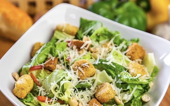Preparada con lechuga romana, jitomate fresco, crutones, queso parmesano, aceitunas negras, pimientos, cacahuates y aderezo italiano