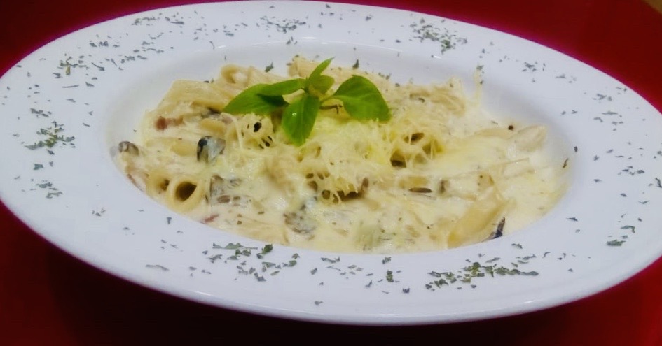 250 GRS DE PASTA A ELEGIR ACOMPAÑADA DE NUESTRA SALSA BLANCA, TOCINO Y CHAMPIÑONES SERVIDA CON QUESO PARMESANO Y PAN DE AJO