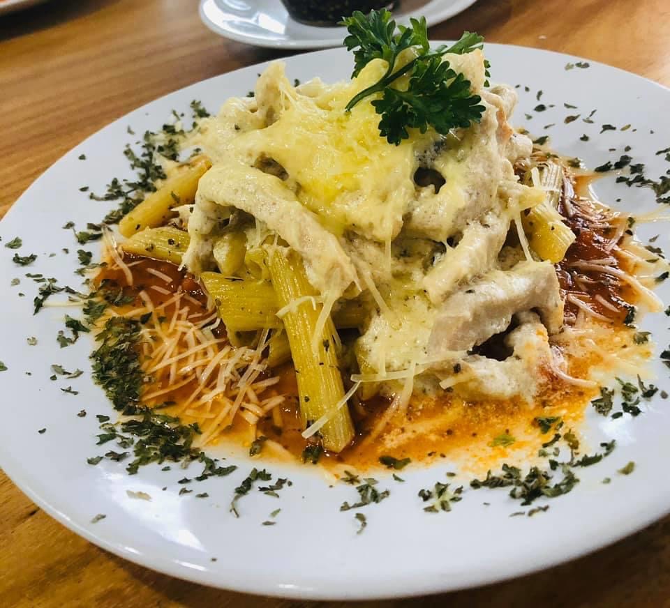 Ricas lajas de pechuga de pollo rebosadas en crema y queso parmesano, cocinadas a la parrilla, servidas en una cama de salsa pomodoro y pasta penne