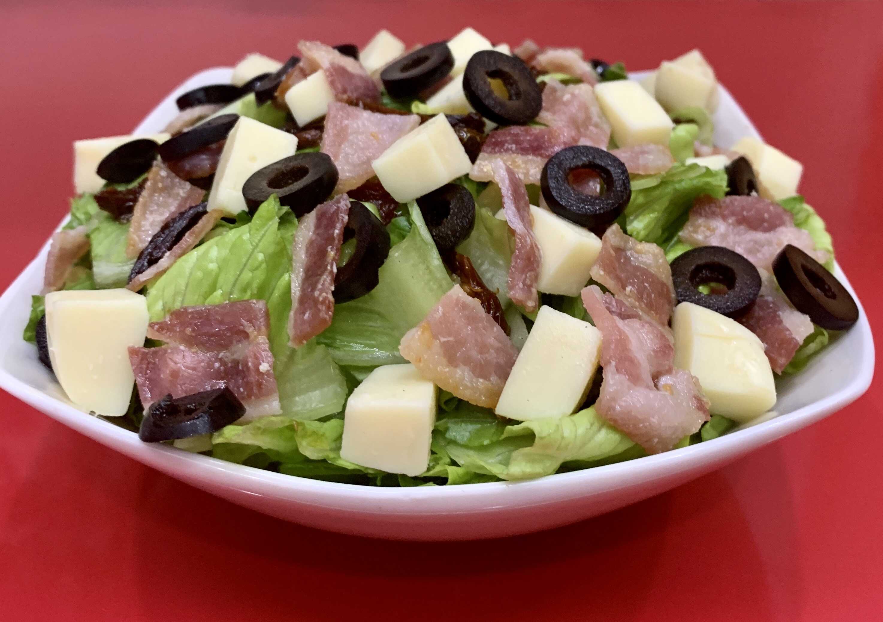 Preparada con lechuga romana, queso mozarella en cubos, tomate deshidratado, aceitunas negras, tocino frito y aderezo de vinagreta