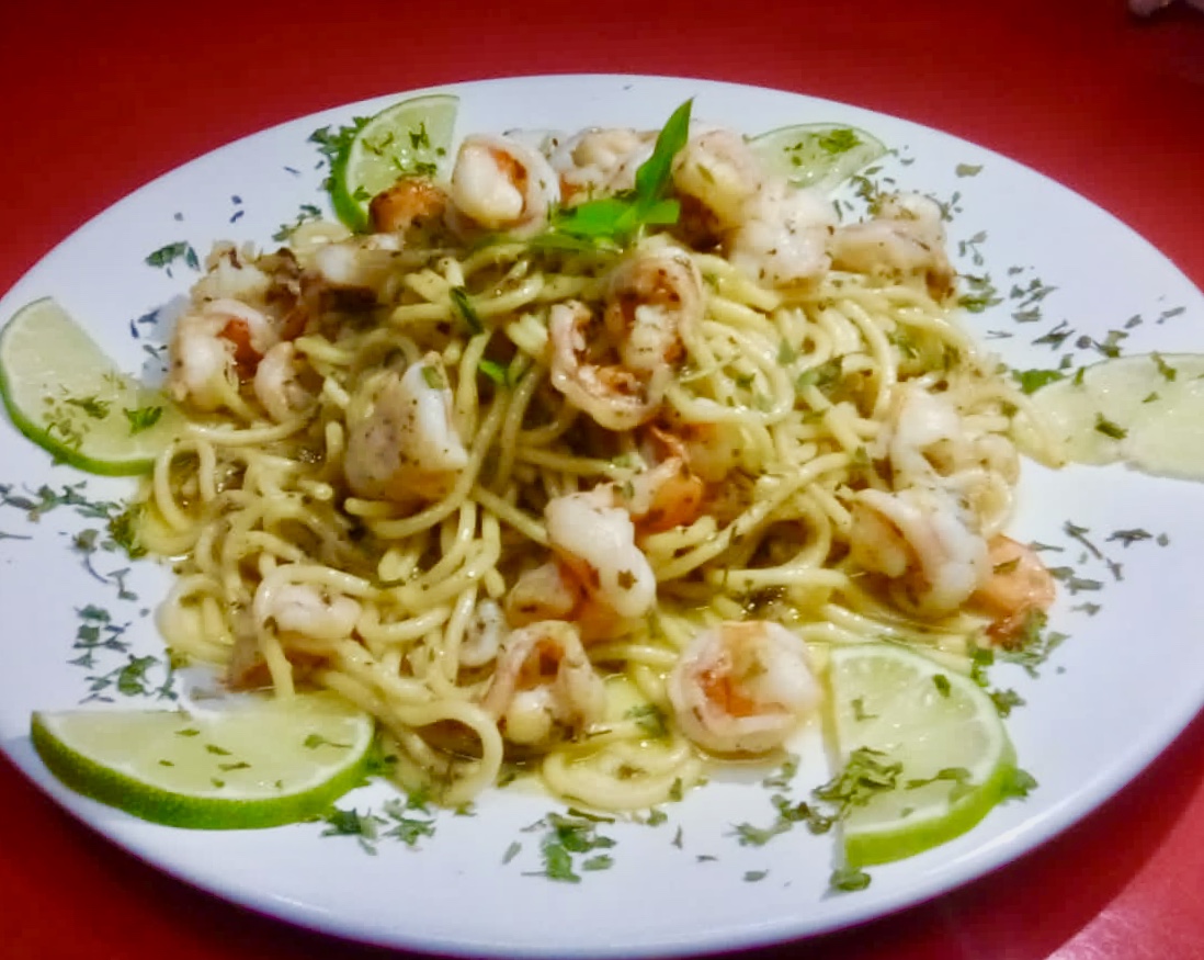 Delicioso spaguetti con camarones salteados en mantequilla de ajo, servidos en una salsa de aceite de oliva, queso parmesano, hierbas italianas y un toque citrico