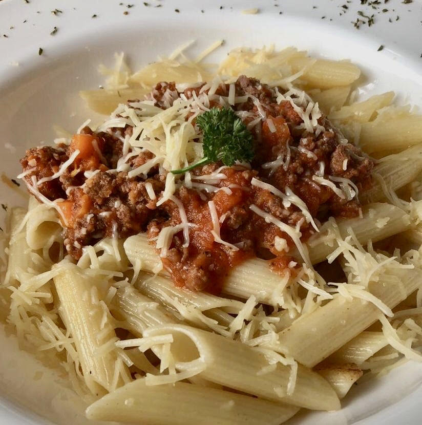 250 grs de pasta a elegir acompañada de nuestra carne bolognesa servida con queso parmesano y pan de ajo