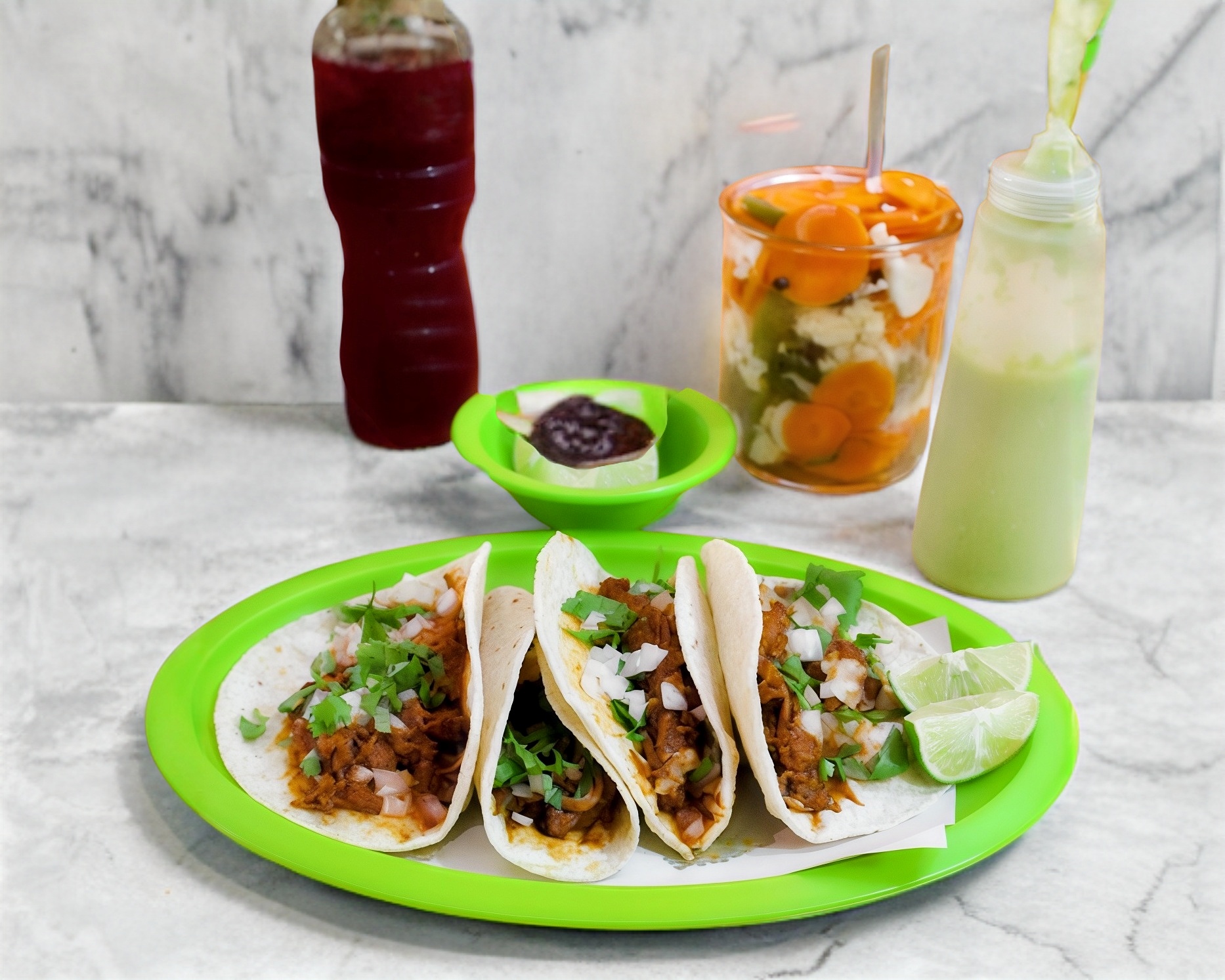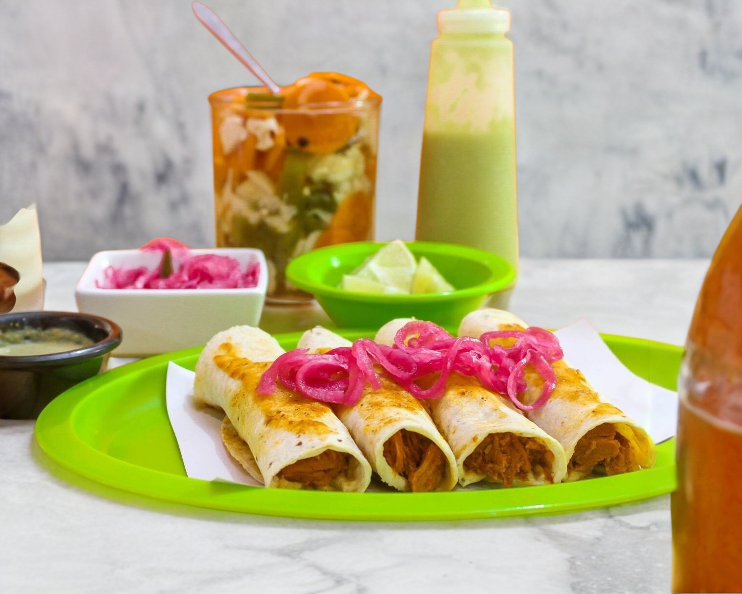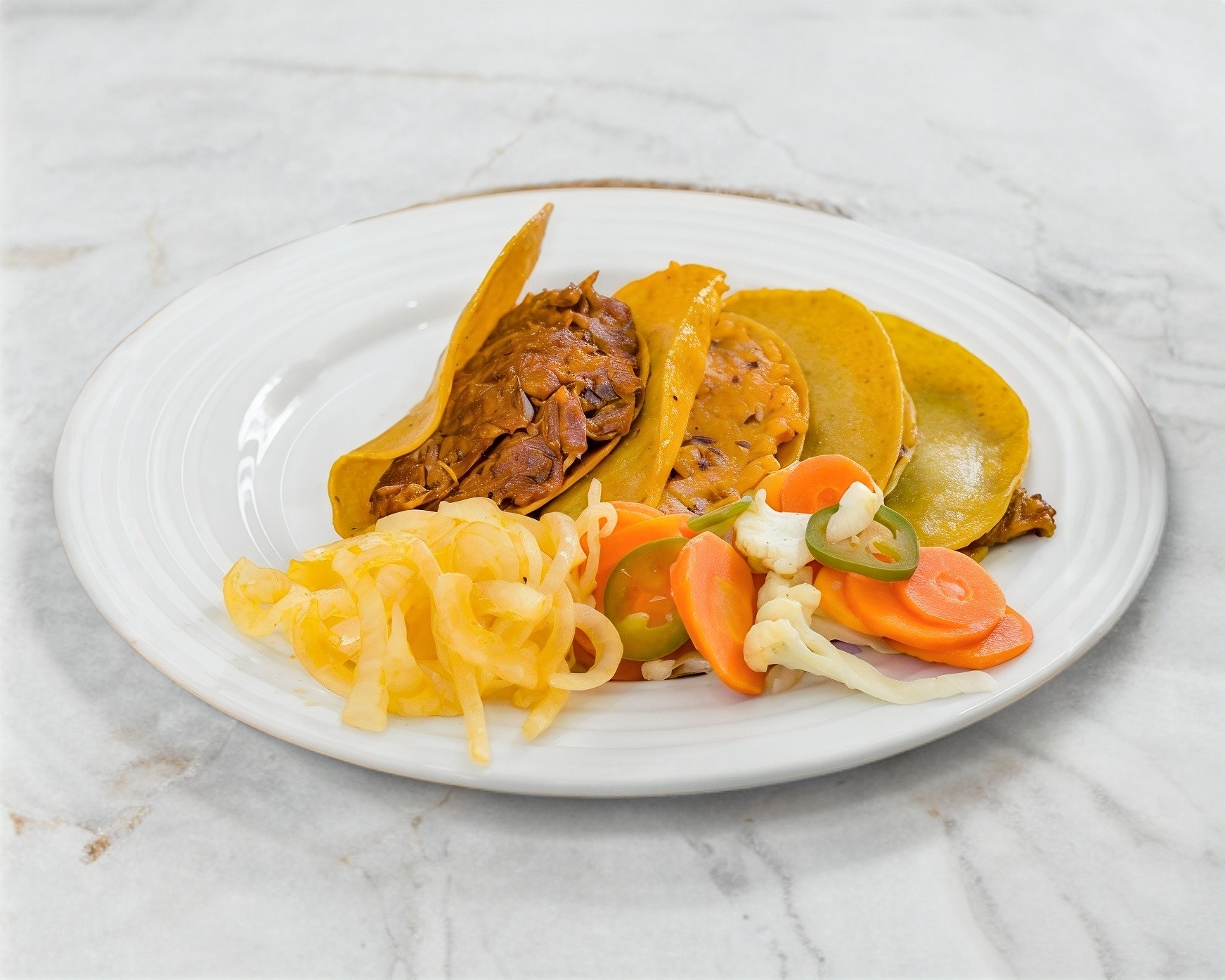 Originales tacos de canasta estilo México, elaborados con tortilla de maíz, acompañados con cebolla asada, salsa verde, salsa macha y verduras curtidas.
