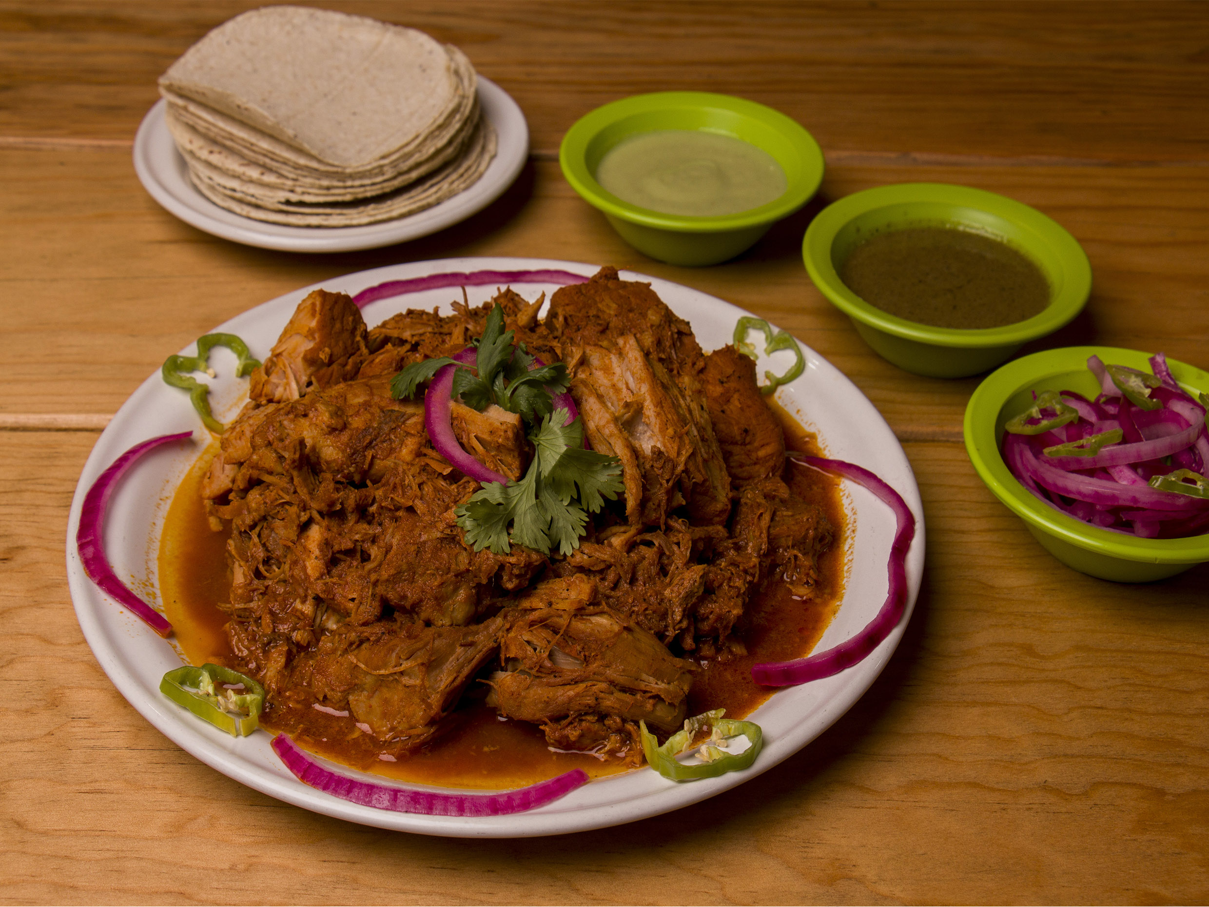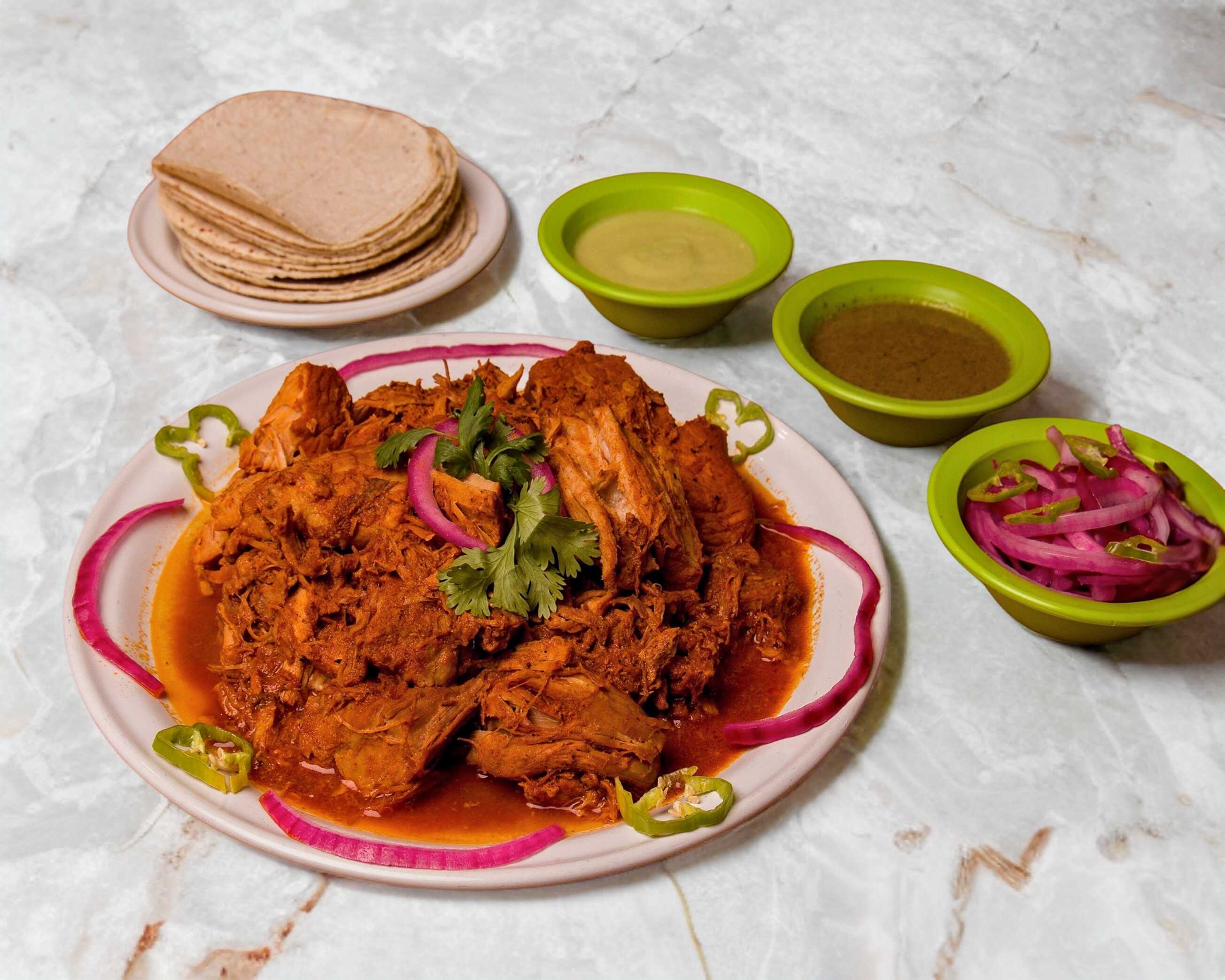Exquisita cochinita pibil de maciza, acompañada de tortillas de maiz, cebolla morada curtida, salsa verde y la muy picosa salsa habanera. Pidela por 1 kg, ½ kg. y ¼ de kg.