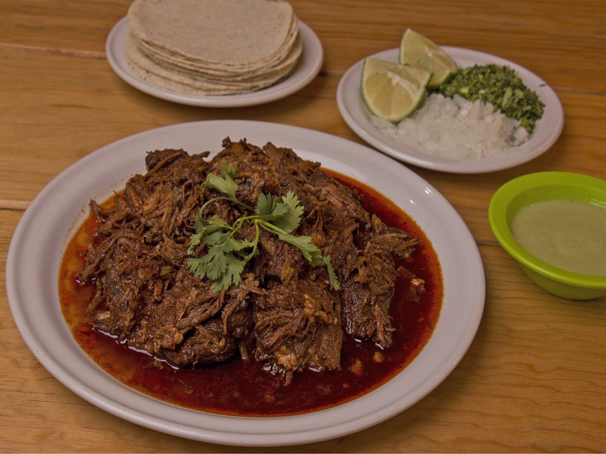 Deliciosa barbacoa de res preparada con jugosa carne de res maciza, acompañada de tortilla de maíz, cilantro, cebolla, limón y salsa verde, pídela por kilo para compartir con tu gente.
