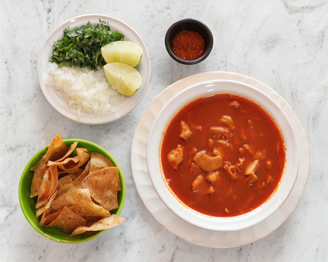 Mondongo rojo estilo México en rojo con pancita de res y garbanzo, acompañado con cebolla, cilantro, limón, chile seco y tortillas.