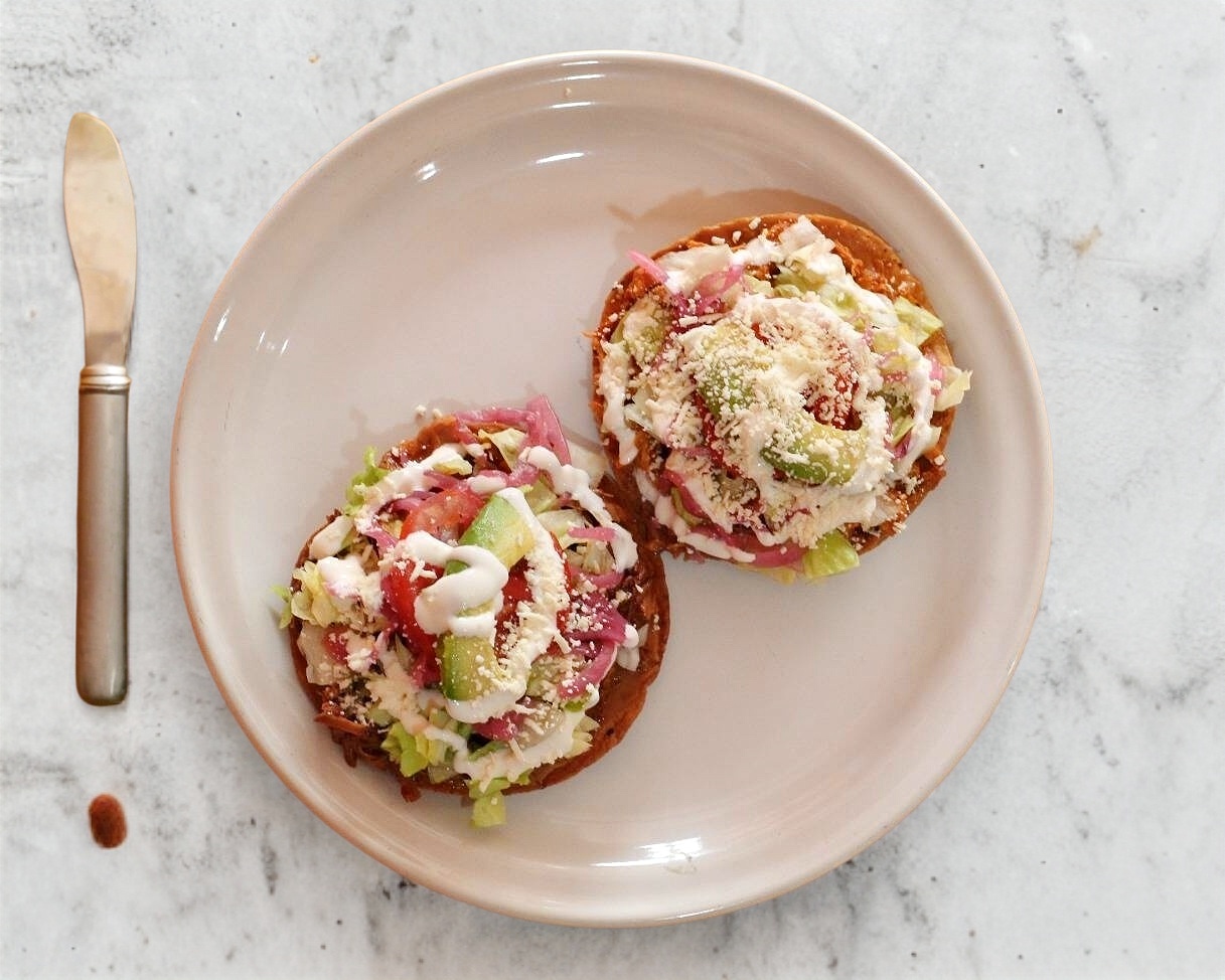 Ricas tostadas preparadas con frijol, lechuga, carne de su elección, jitomate, cebolla morada, aguacate, crema y queso tabasco. escoge tu guiso favorito: chicharrón prensado, cochinita o barbacoa.