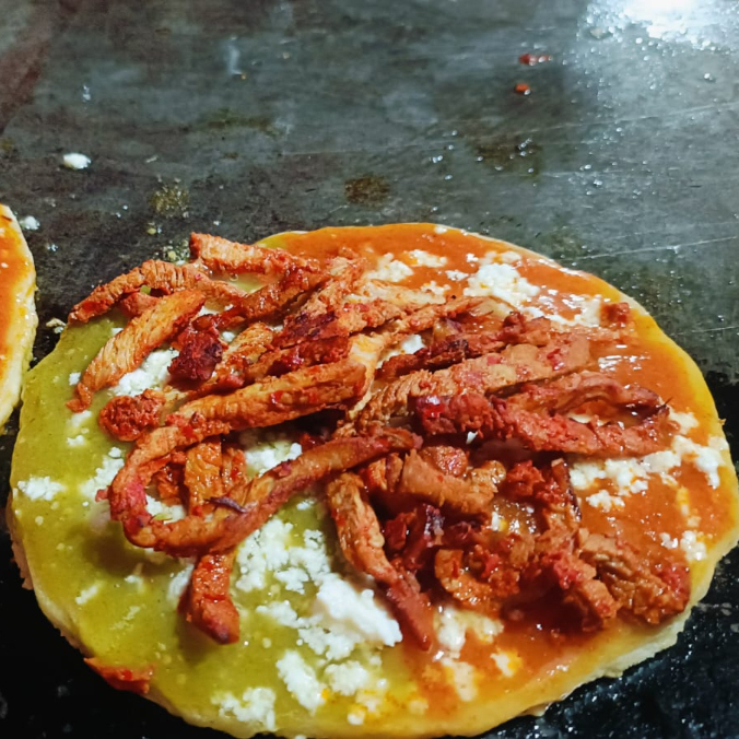 Deliciosa tortilla cocida en comal hecha de masa con frijol, bañada en salsa, cubierta con repollo, queso, crema, aguacate y el complemento de tu elección.
