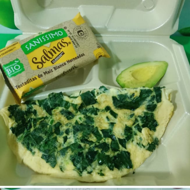 2 Piezas de huevo con espinaca y champiñones, relleno de Jamón de pavo y queso panela, acompañados de aguacate, tostadas salmas y fruta