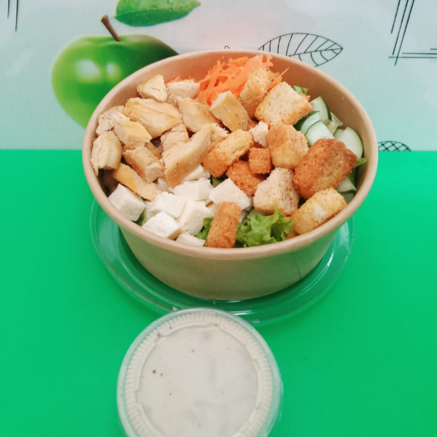 Pollo a la plancha, lechuga, rayadura de zanahoria, pepino, queso panela, crutones, aderezo