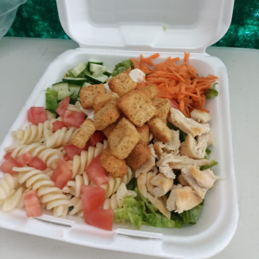 Pollo a la plancha, porción de pasta, lechuga, zanahoria, pepino, queso panela, tomate, crutones, aderezo