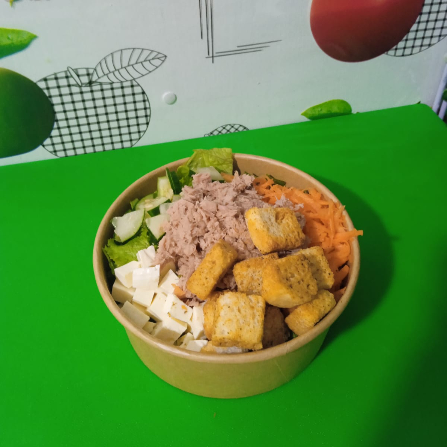 Atún, lechuga, rayadura de zanahoria, pepino, queso panela, crotones, aderezo