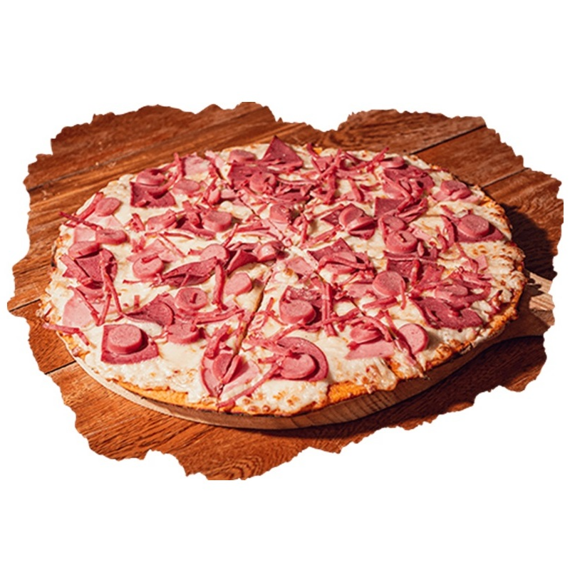 Con salsa de tomate de la casa, queso, jamón, salami y tocino.