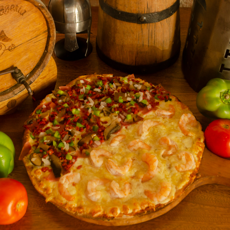 Salsa de tomate de la casa, queso, camarón, salsa de ajo de la casa, jamón, salami, chorizo, champiñón, cebolla y pimiento.