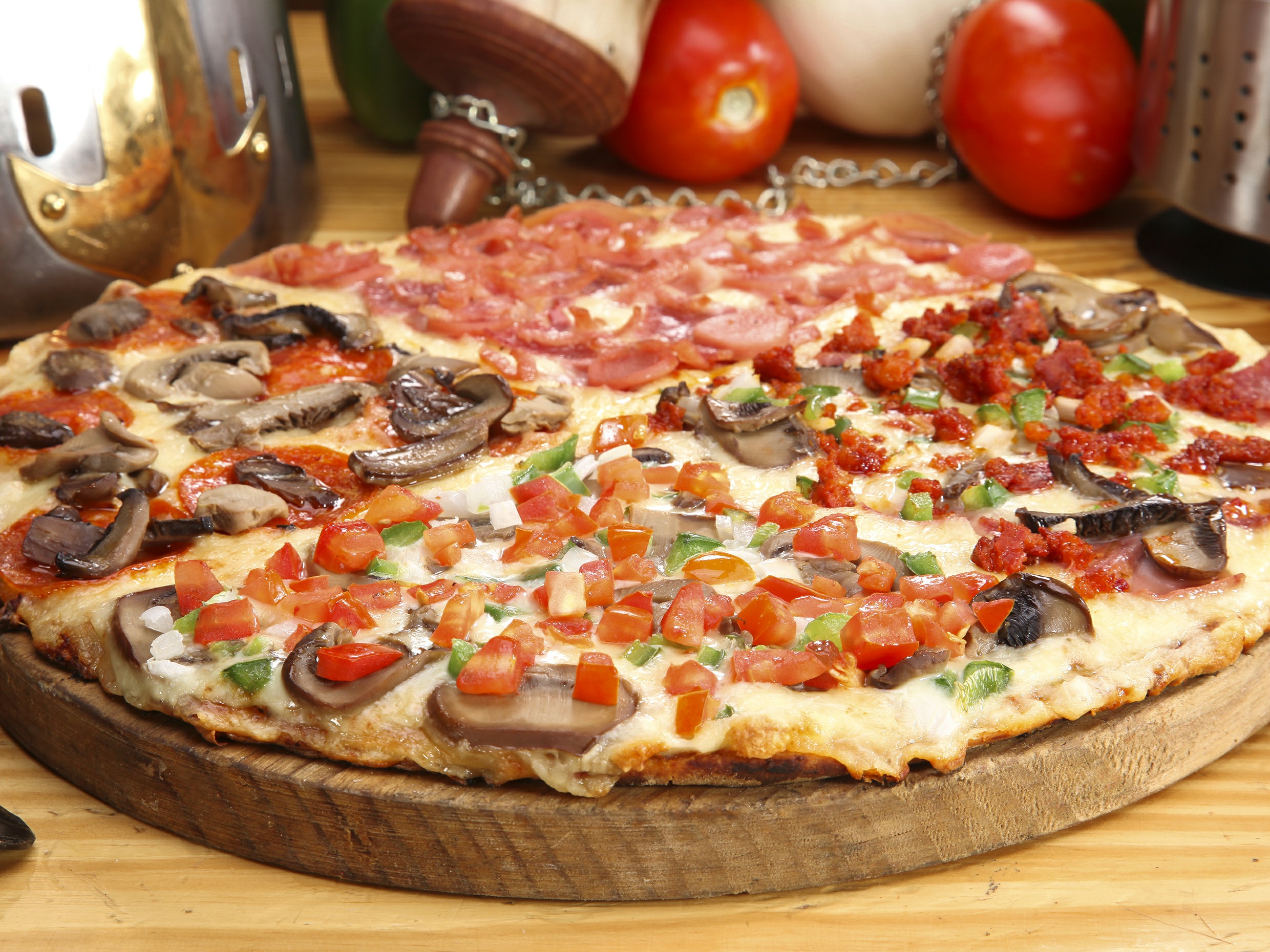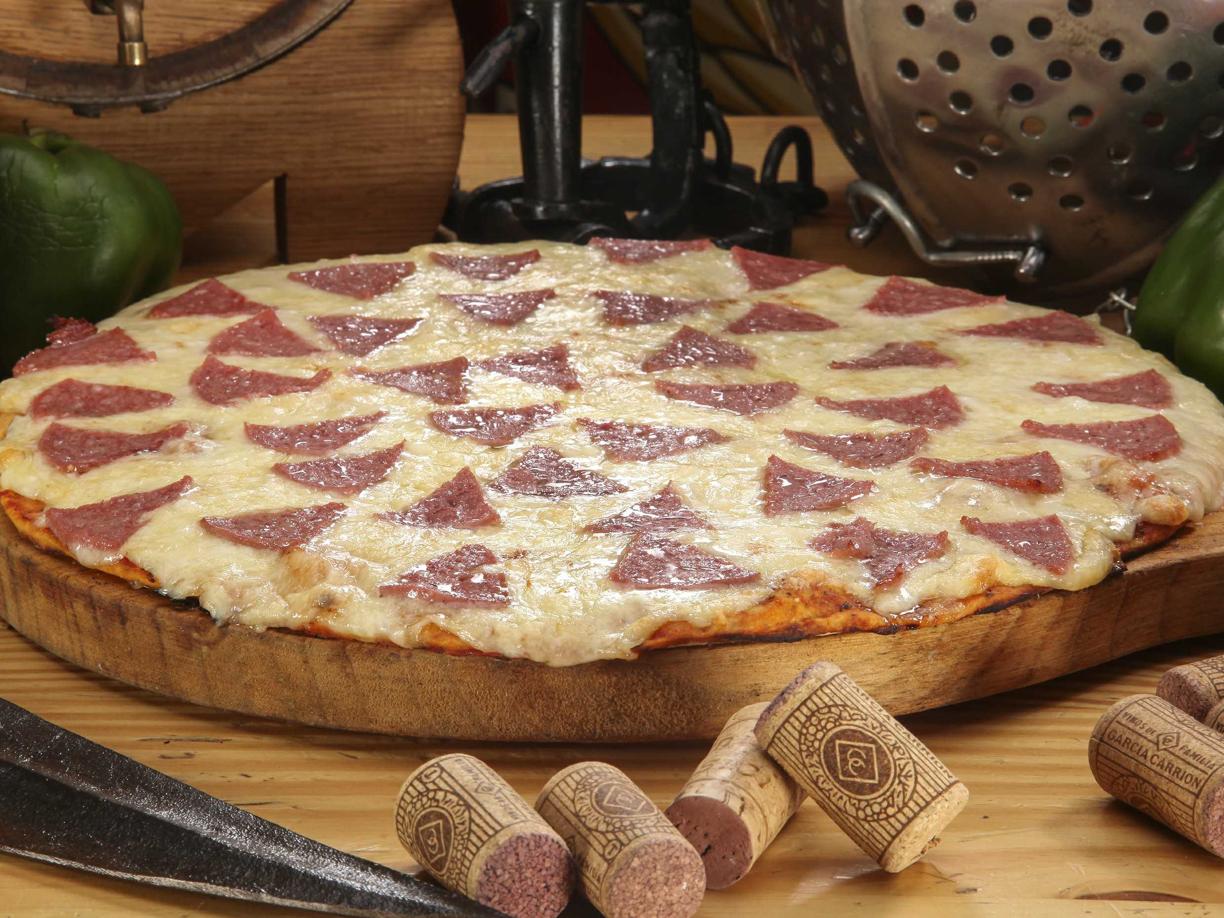 Con salsa de tomate de la casa, queso, jamón, salami, chorizo, champiñón, cebolla y pimiento.