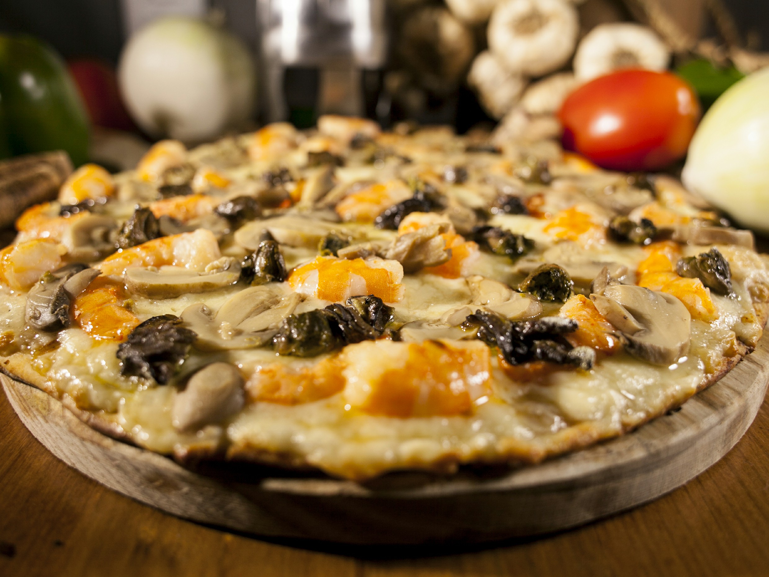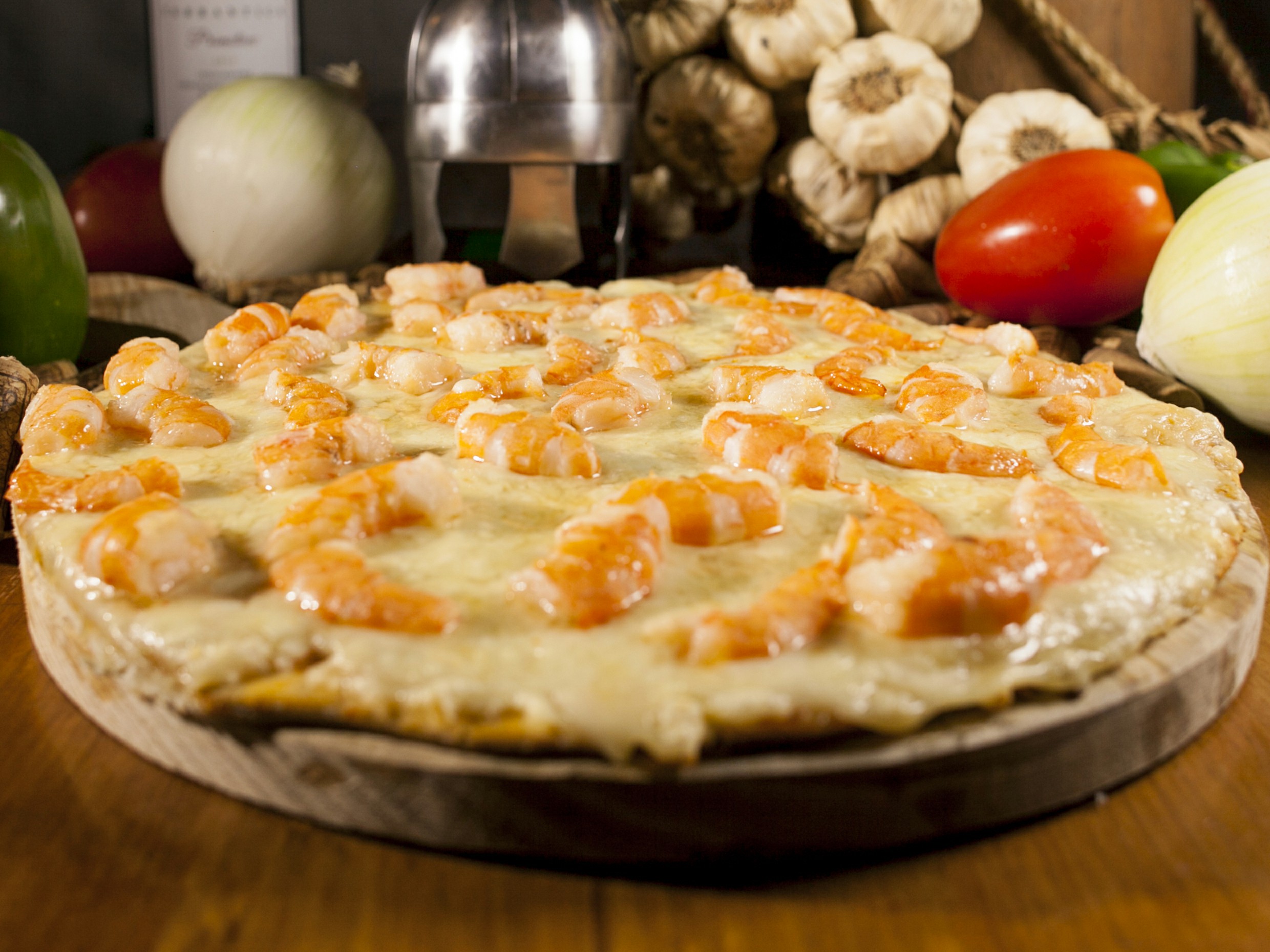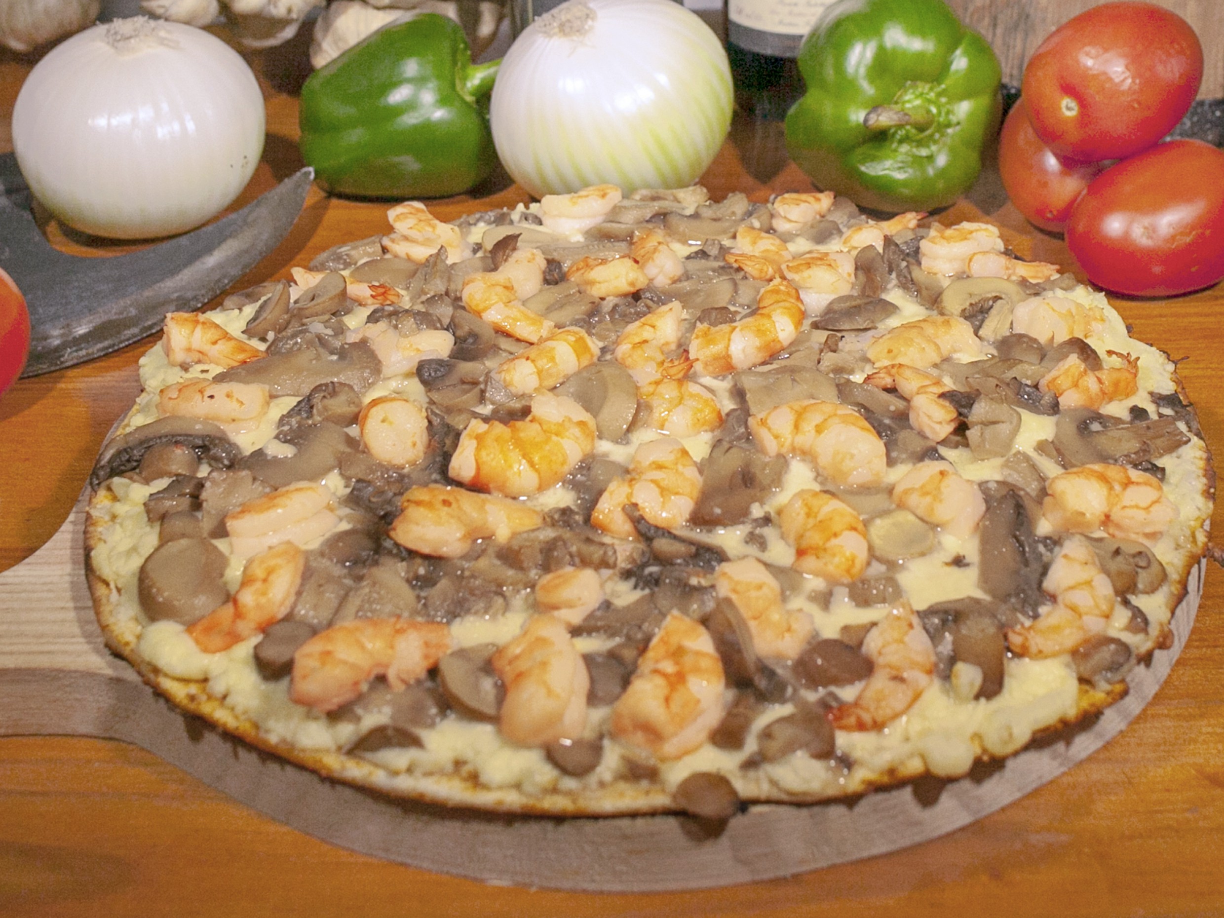 Salsa de tomate de la casa, queso, camarón, salsa de ajo de la casa, jamón, salami, chorizo, champiñón, cebolla y pimiento.