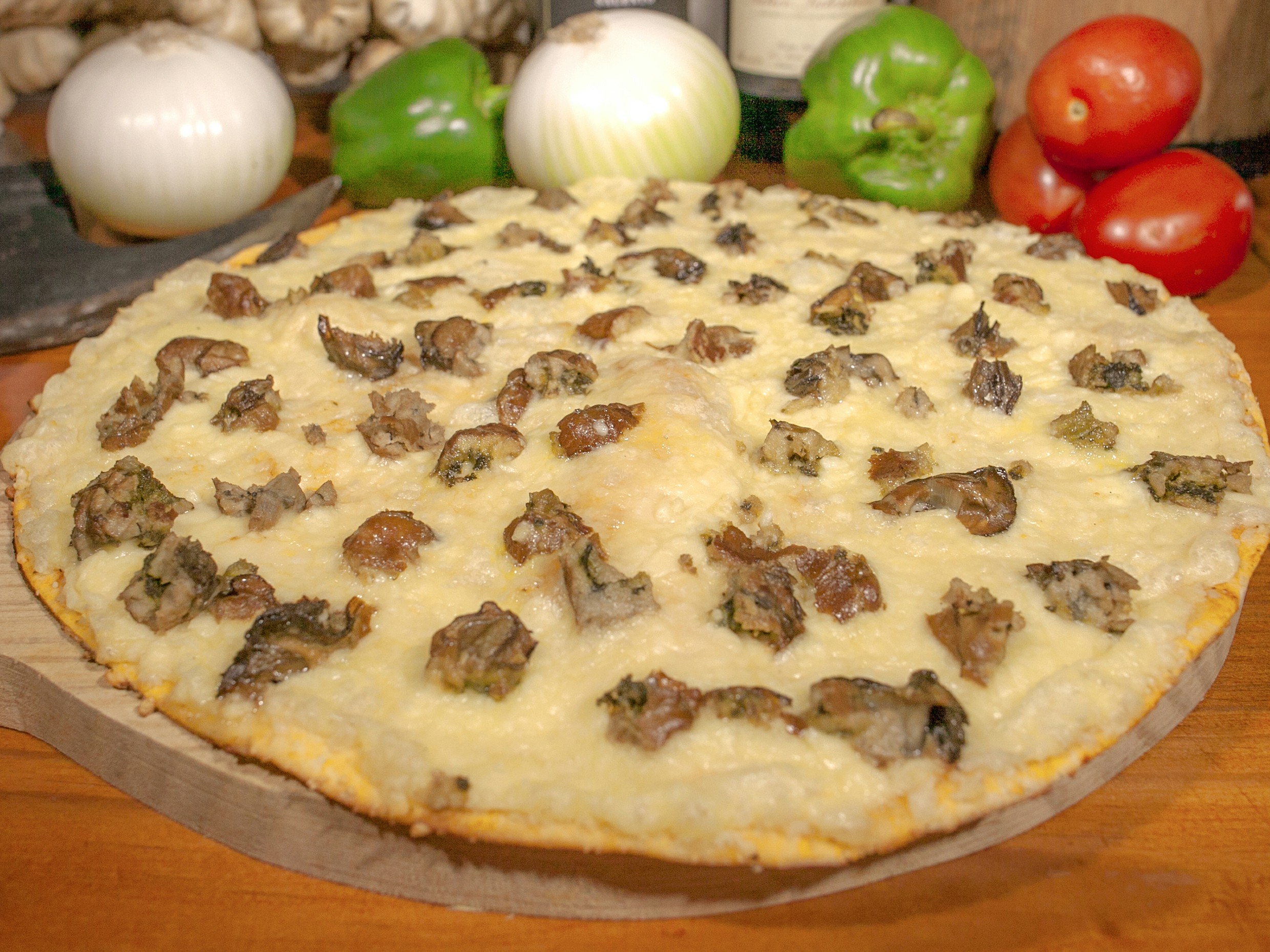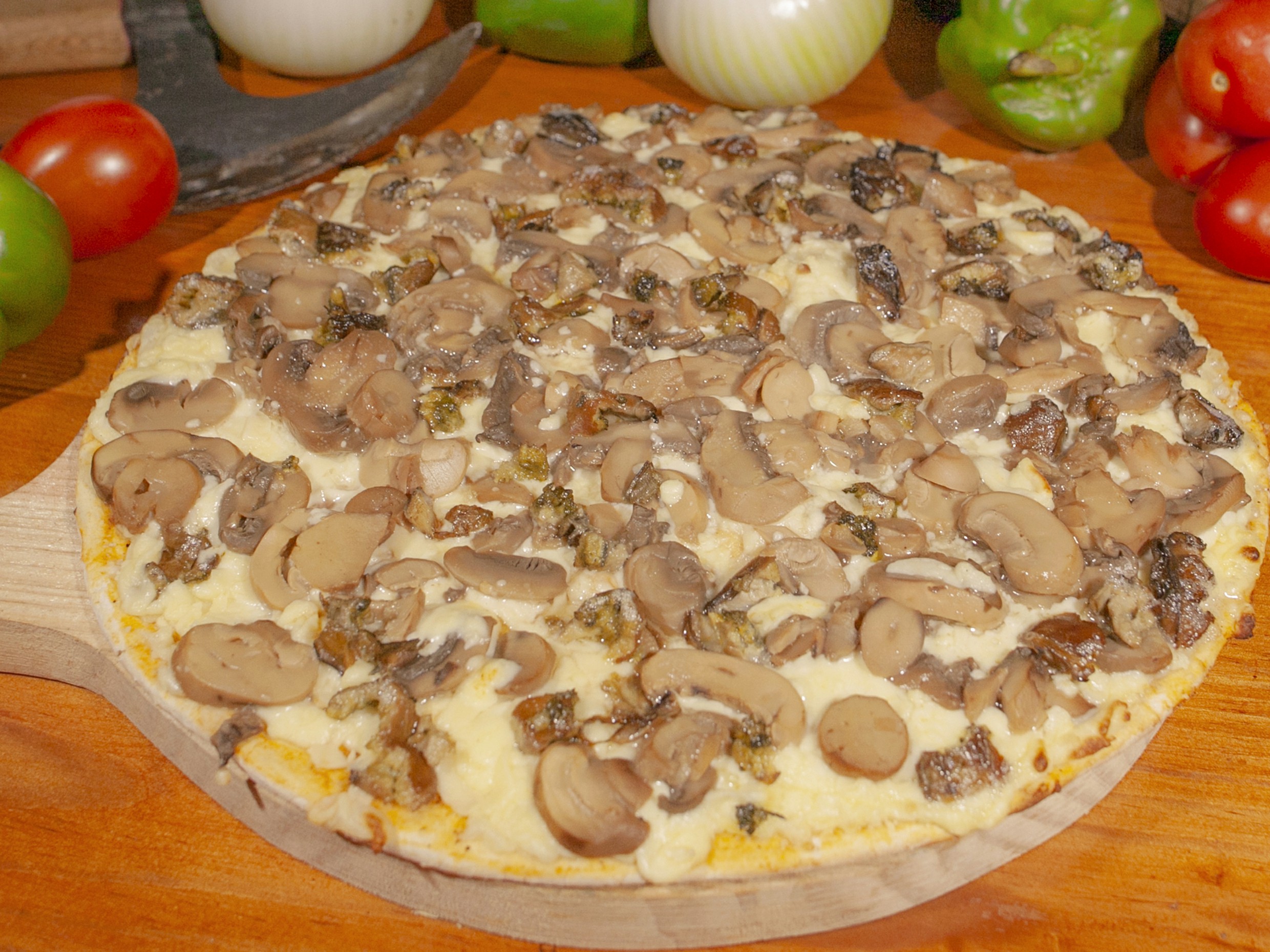 Con salsa de tomate de la casa, champiñón, queso y salsa ajo de la casa.