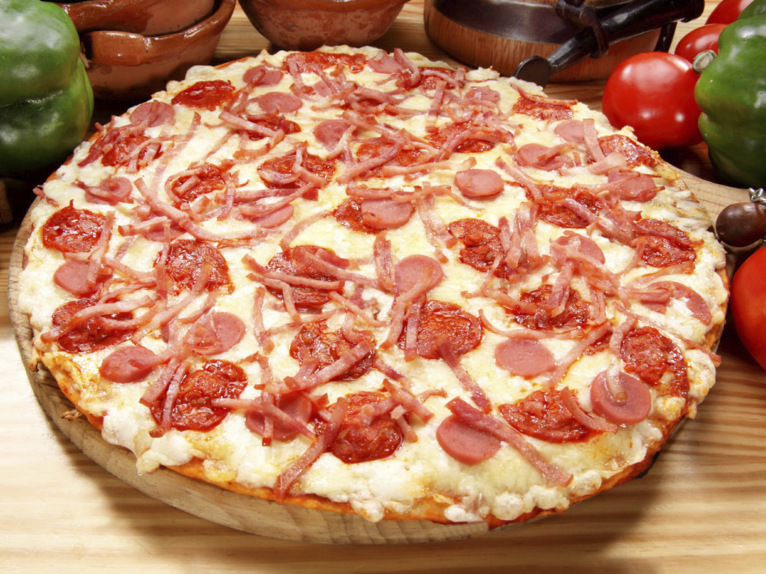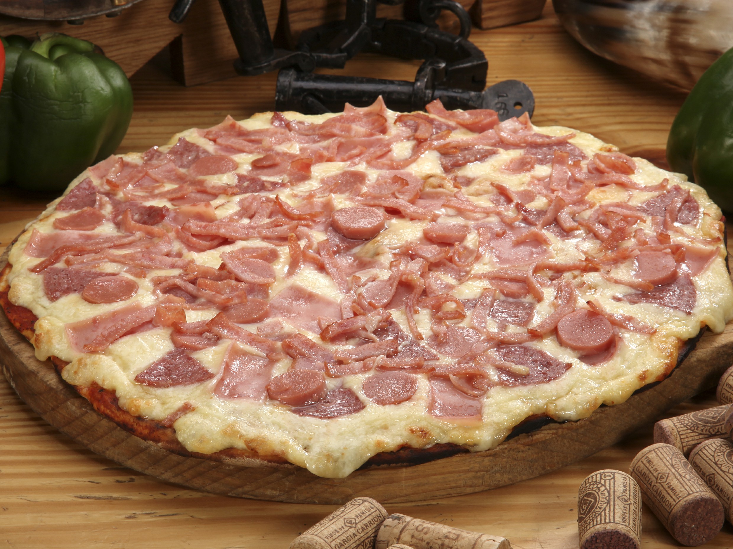 Con salsa de tomate de la casa, queso, jamón, salami y tocino.