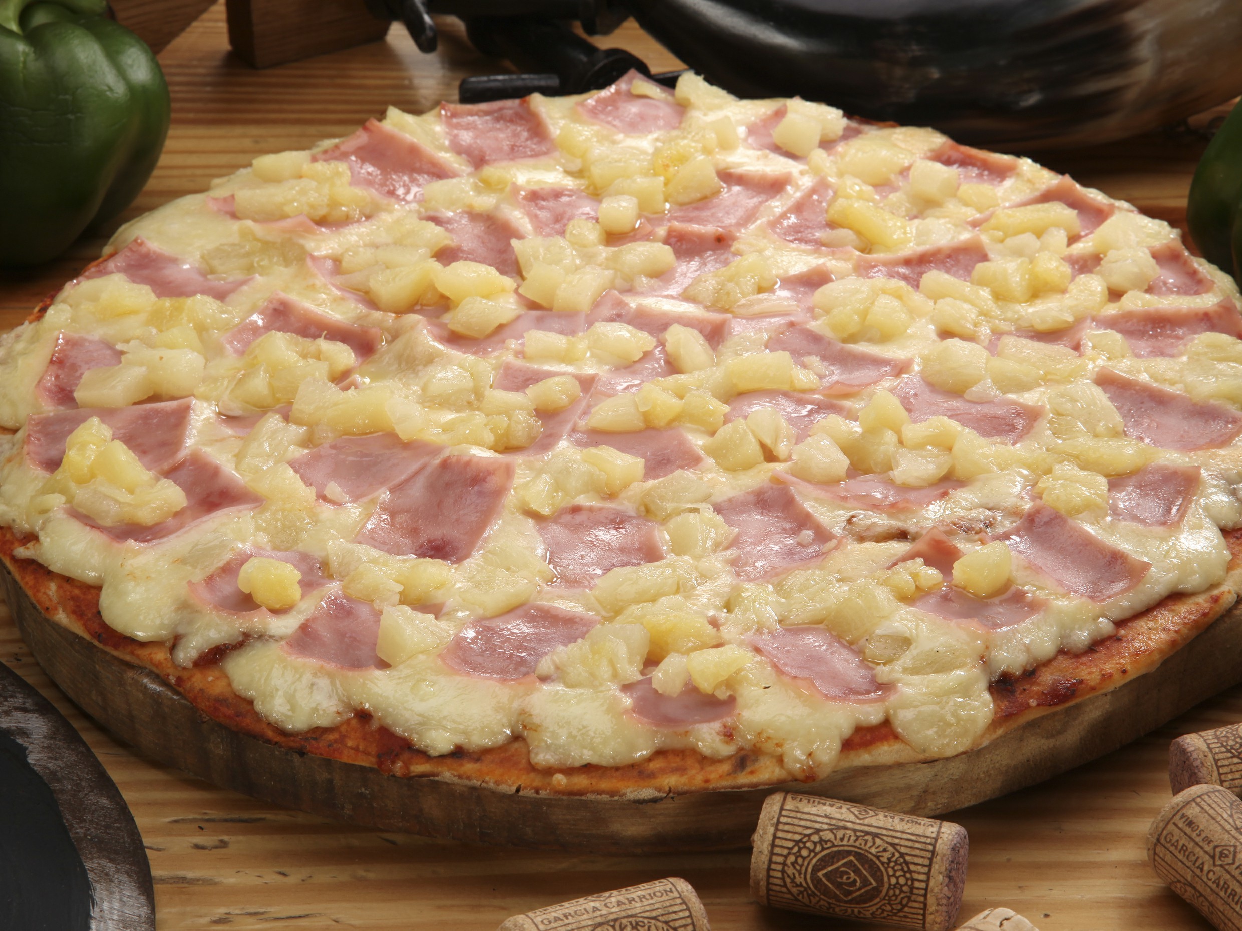 Con salsa de tomate de la casa, queso, jamón y piña.