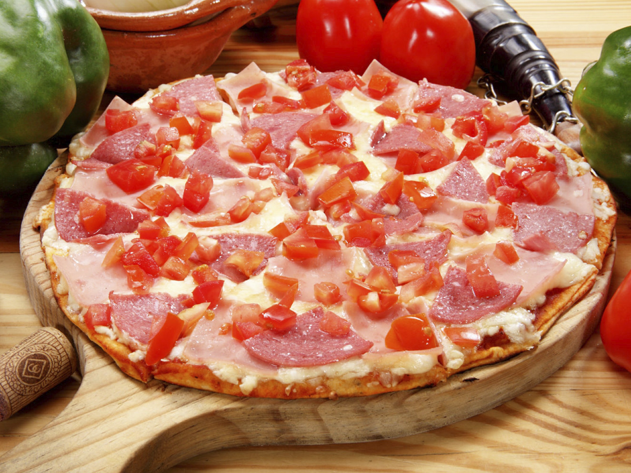 Con salsa de tomate de la casa, queso, jamón, salami y tomate fresco.