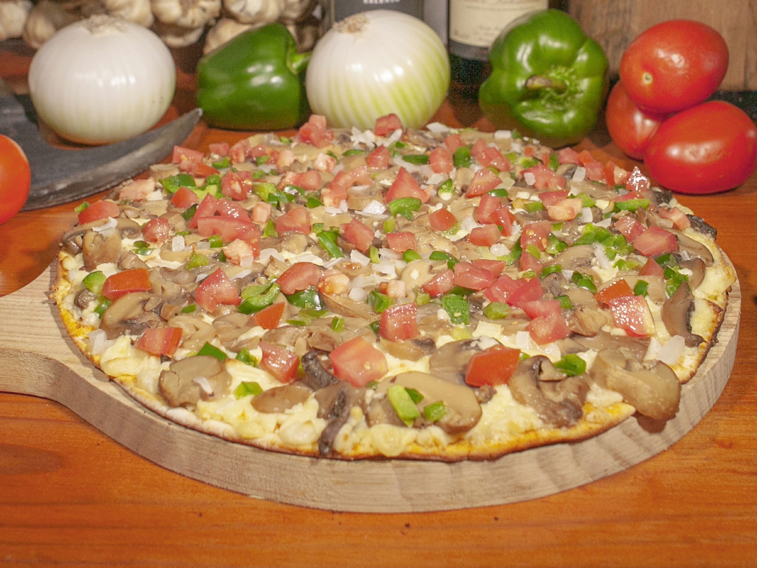 Con salsa tomate de la casa, queso tomate fresco, champiñón, cebolla y pimiento.
