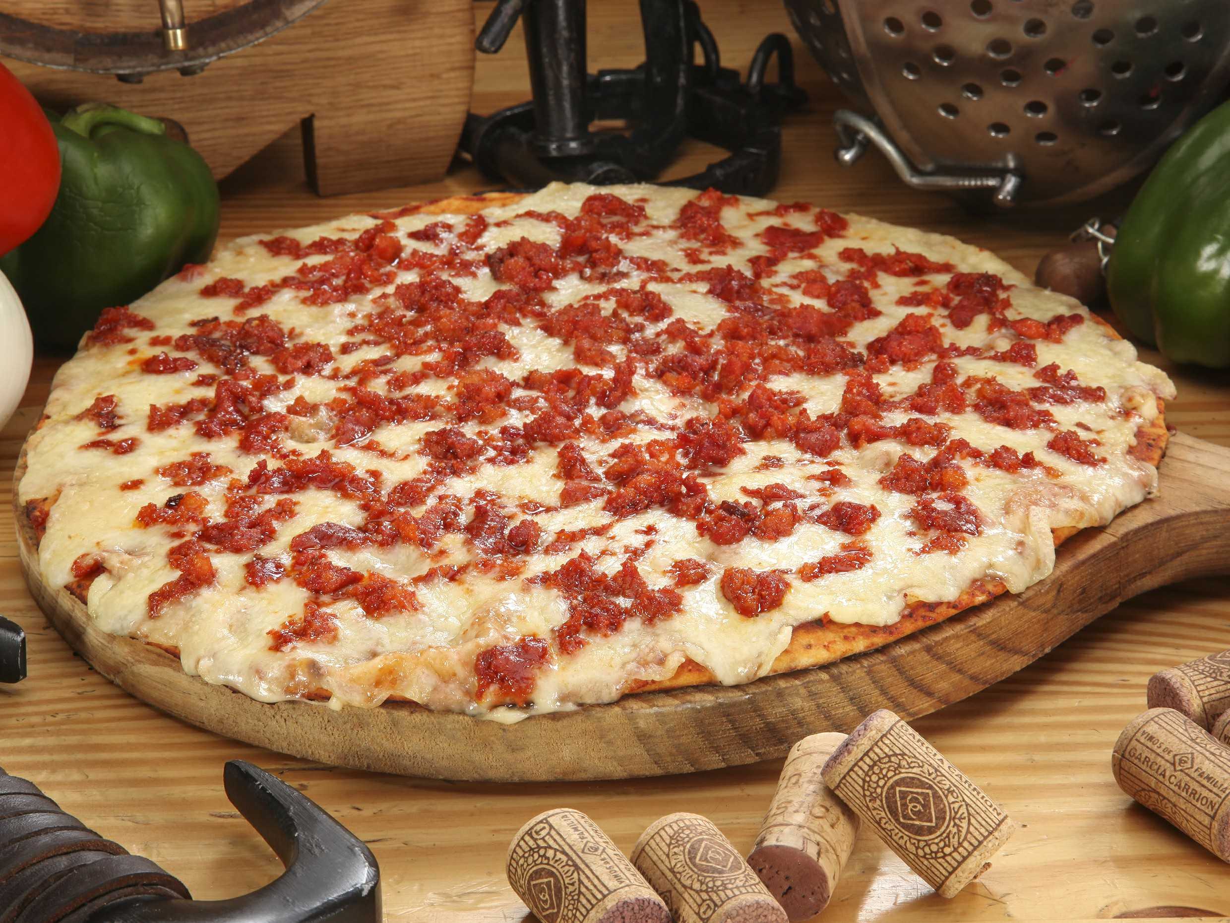 Con salsa de tomate, queso, chorizo cantímpalo, tocino y salchicha.